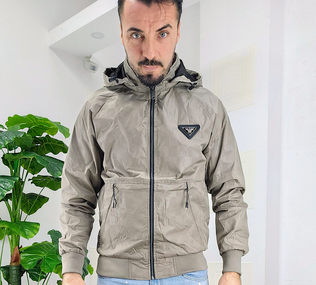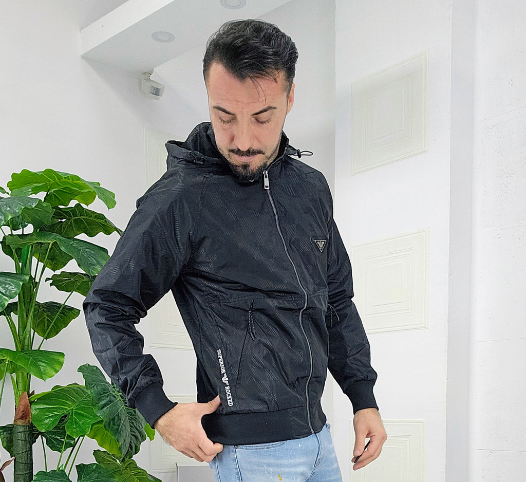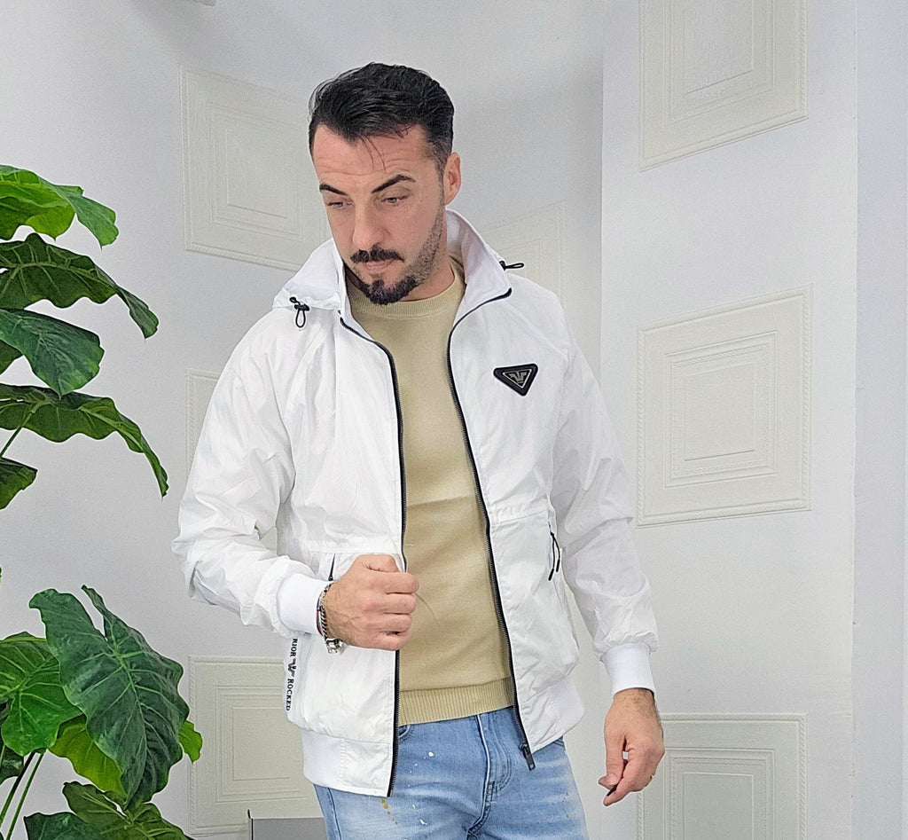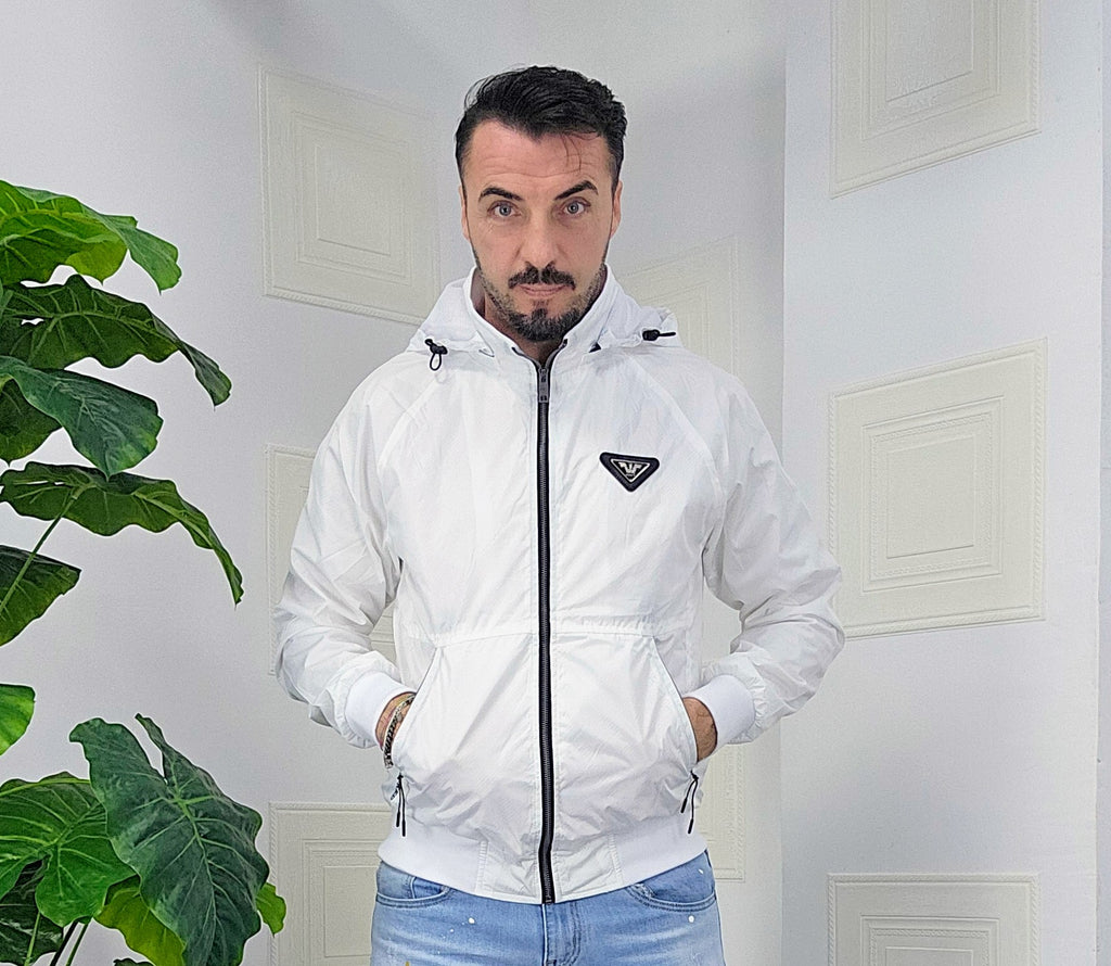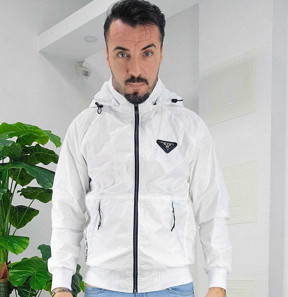 Giubbino primaverile vestibilità comoda antipioggia antivento chiusura zip centrale 2 chiusura zip laterale cappuccio regolabile estraibile effetto logo esterno targhetta in metallo lato cuore scritta cucita sul laterale dalla M alla XXL, il modello in foto è alto 1.82x76kg è indossa una taglia M.Prodotto Made in Italy