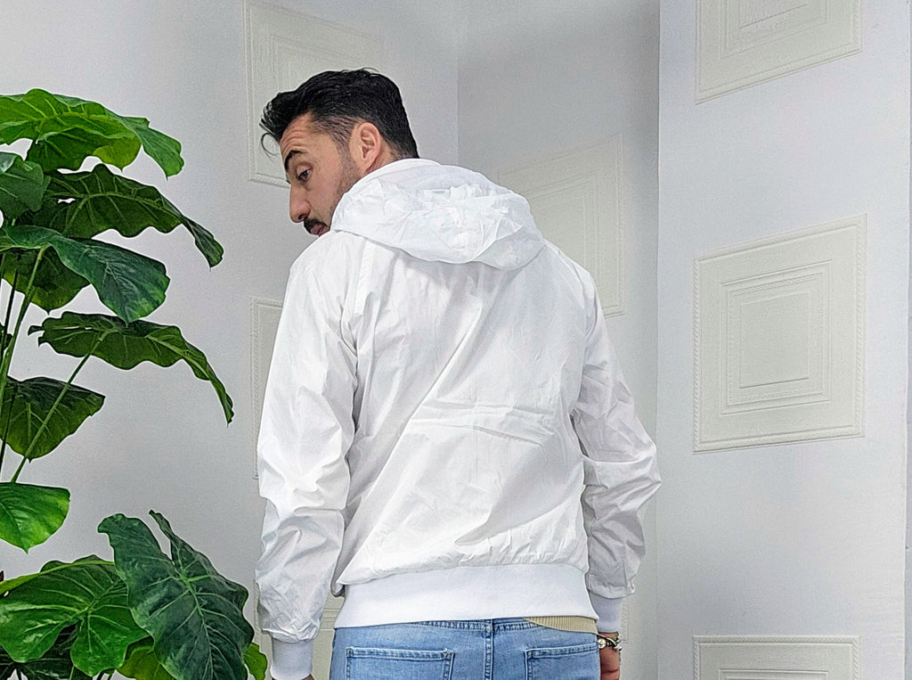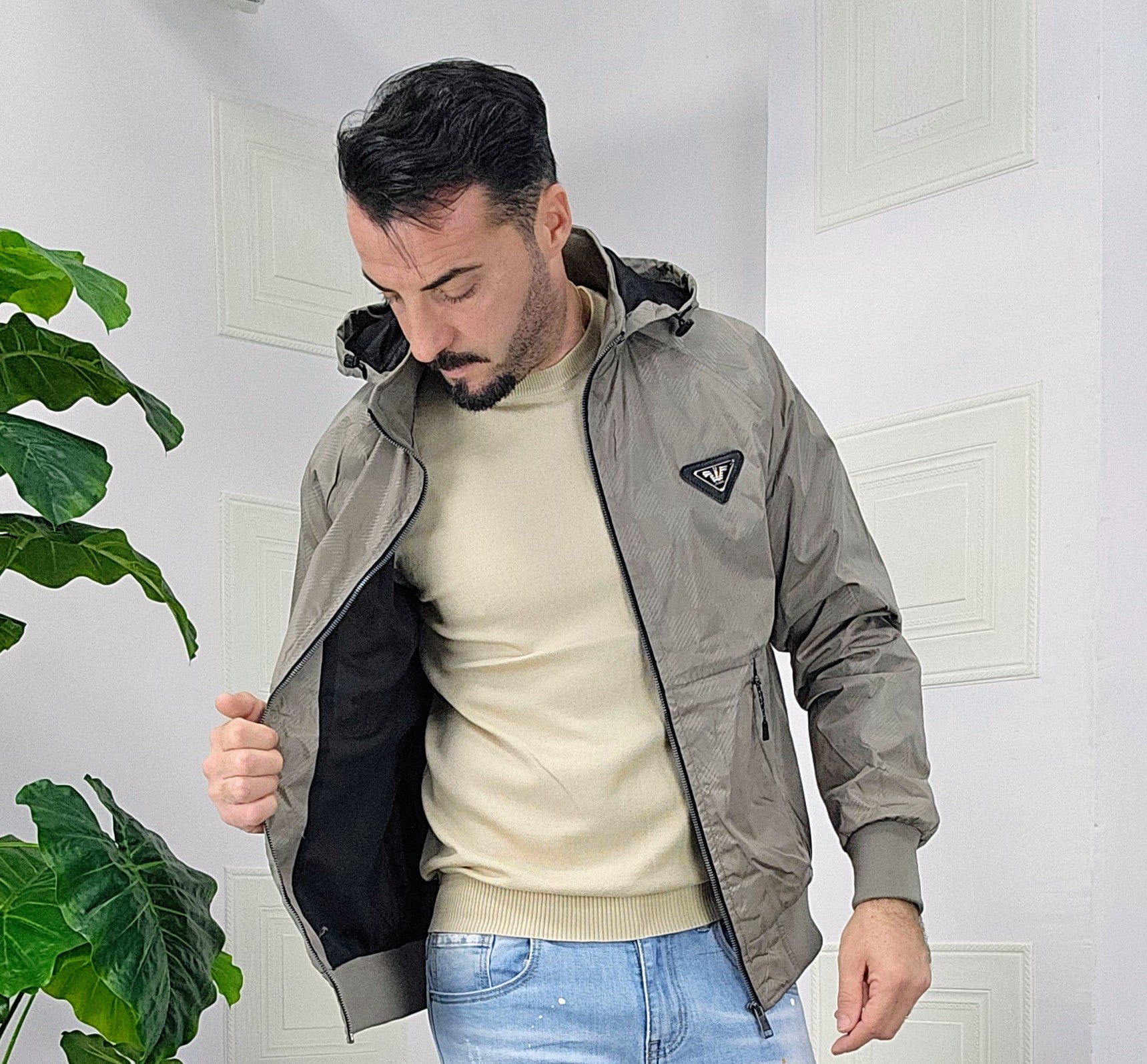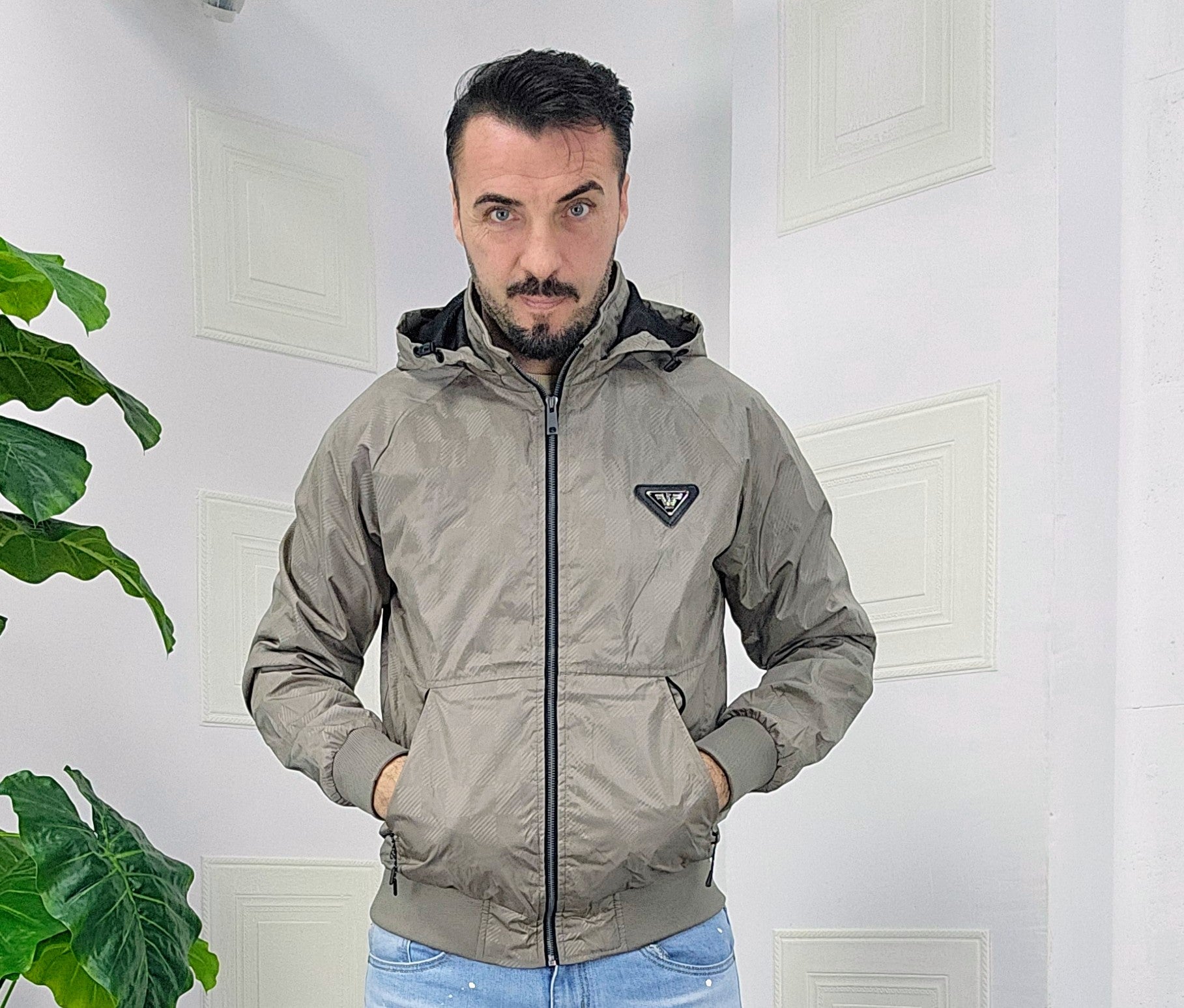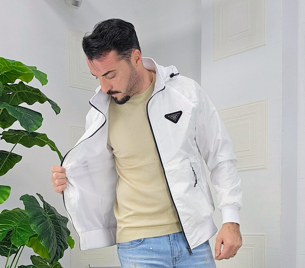 Giubbino primaverile vestibilità comoda antipioggia antivento chiusura zip centrale 2 chiusura zip laterale cappuccio regolabile estraibile effetto logo esterno targhetta in metallo lato cuore scritta cucita sul laterale dalla M alla XXL, il modello in foto è alto 1.82x76kg è indossa una taglia M.Prodotto Made in Italy