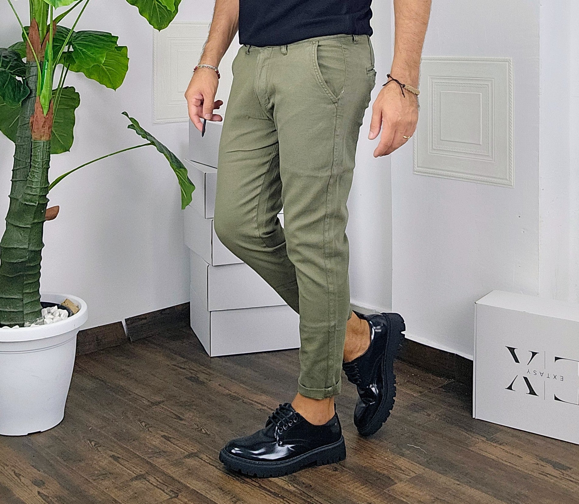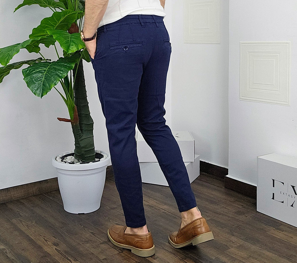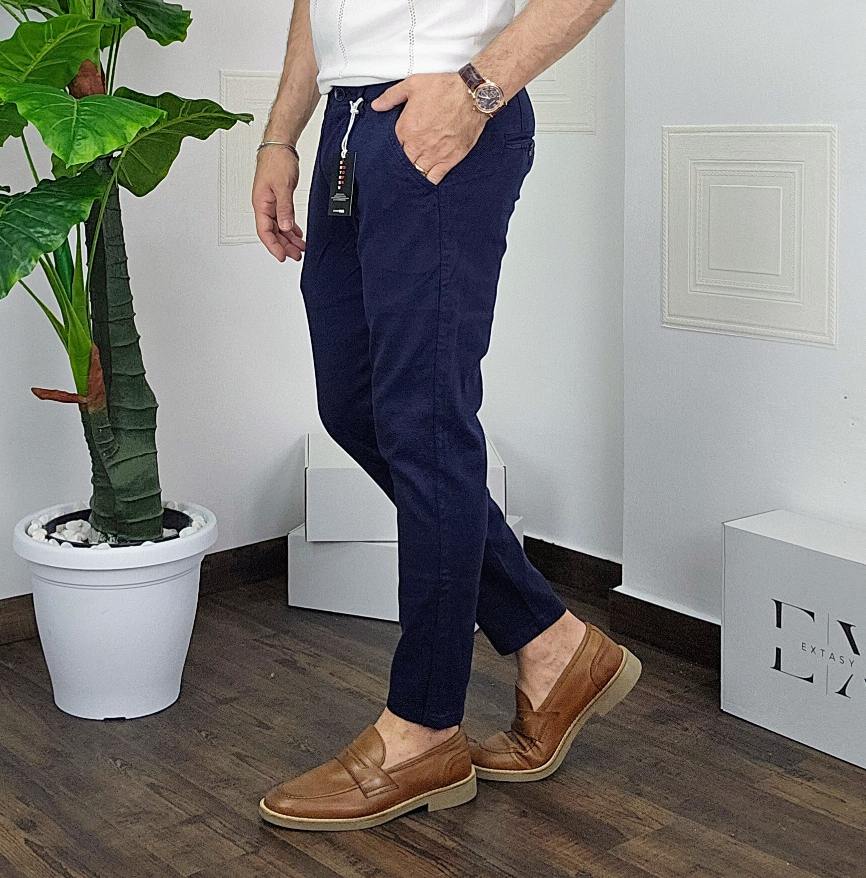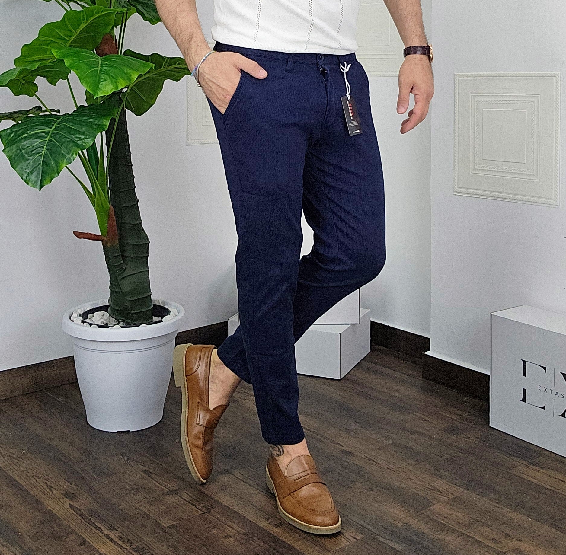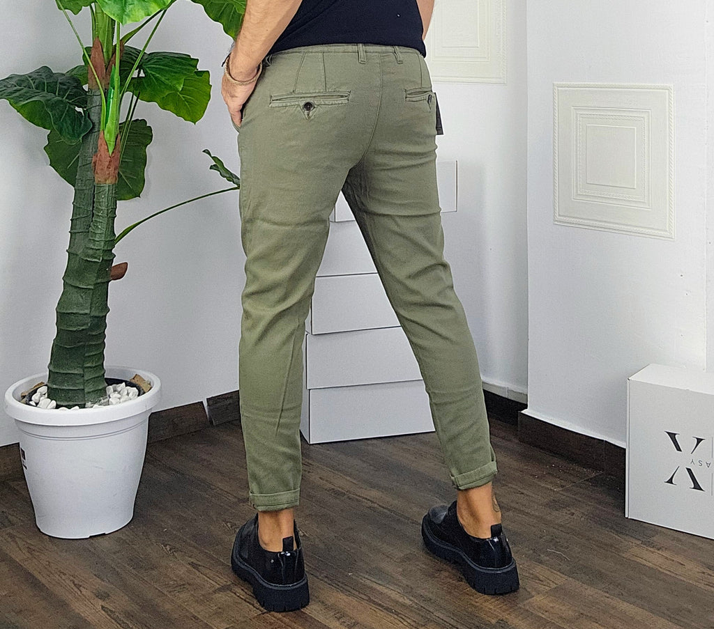 Pantalone slim fit elastico tessuto a nido d'ape con 2 tasche America e 2 tasche sul retro con chiusura bottone dalla 44 alla 54,il modello in foto è alto 1.82x76kg è indossa una taglia 44.Prodotto Made in Italy