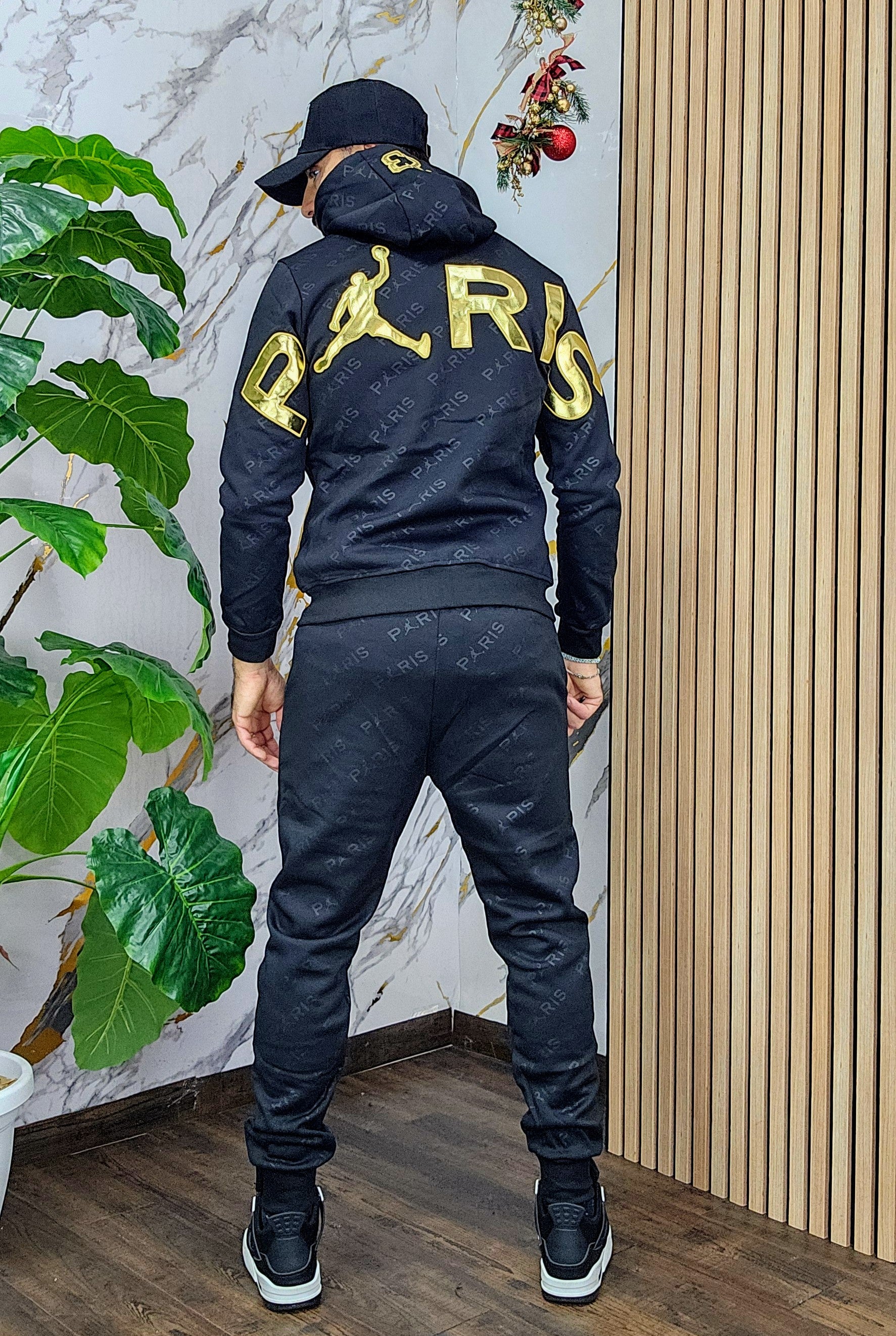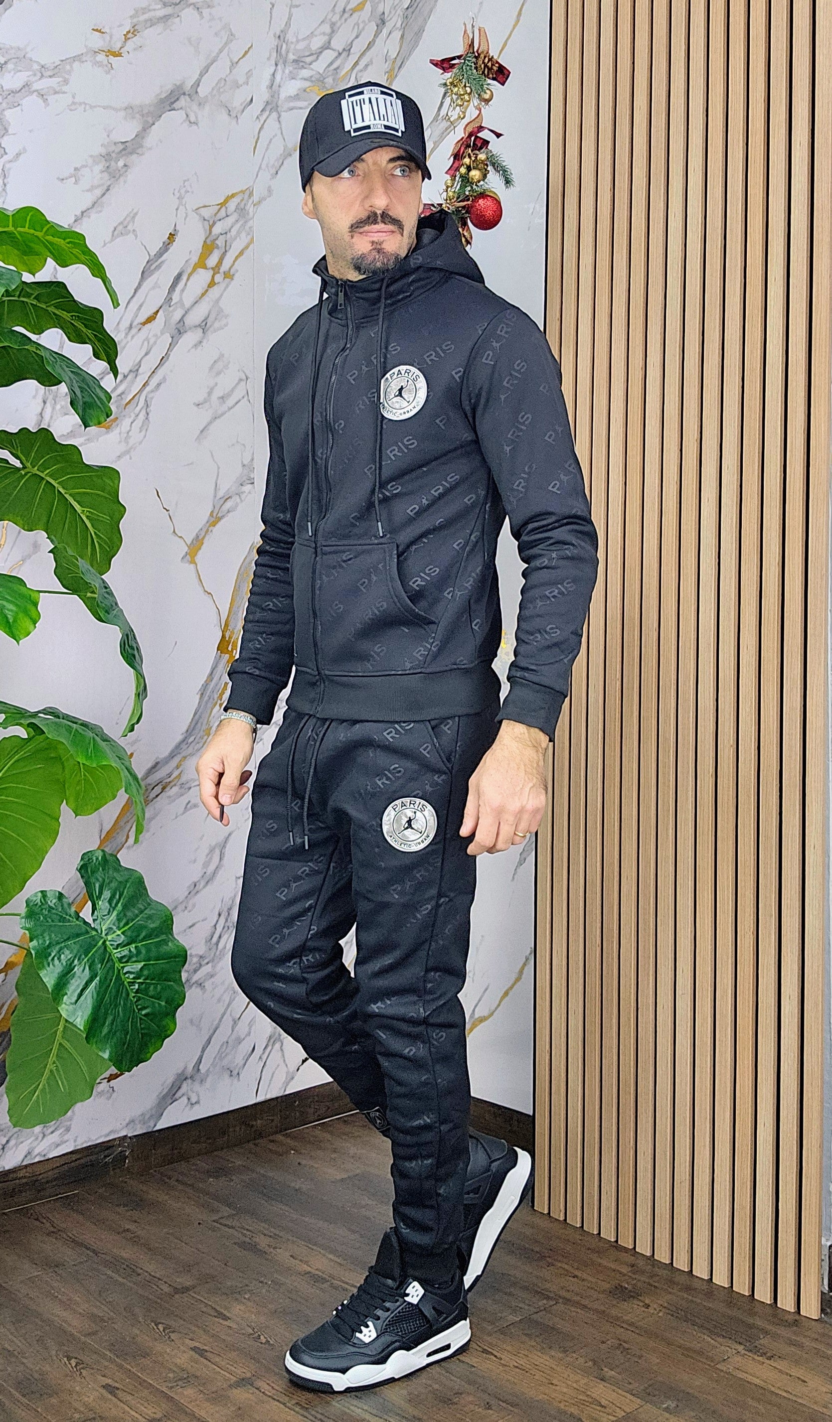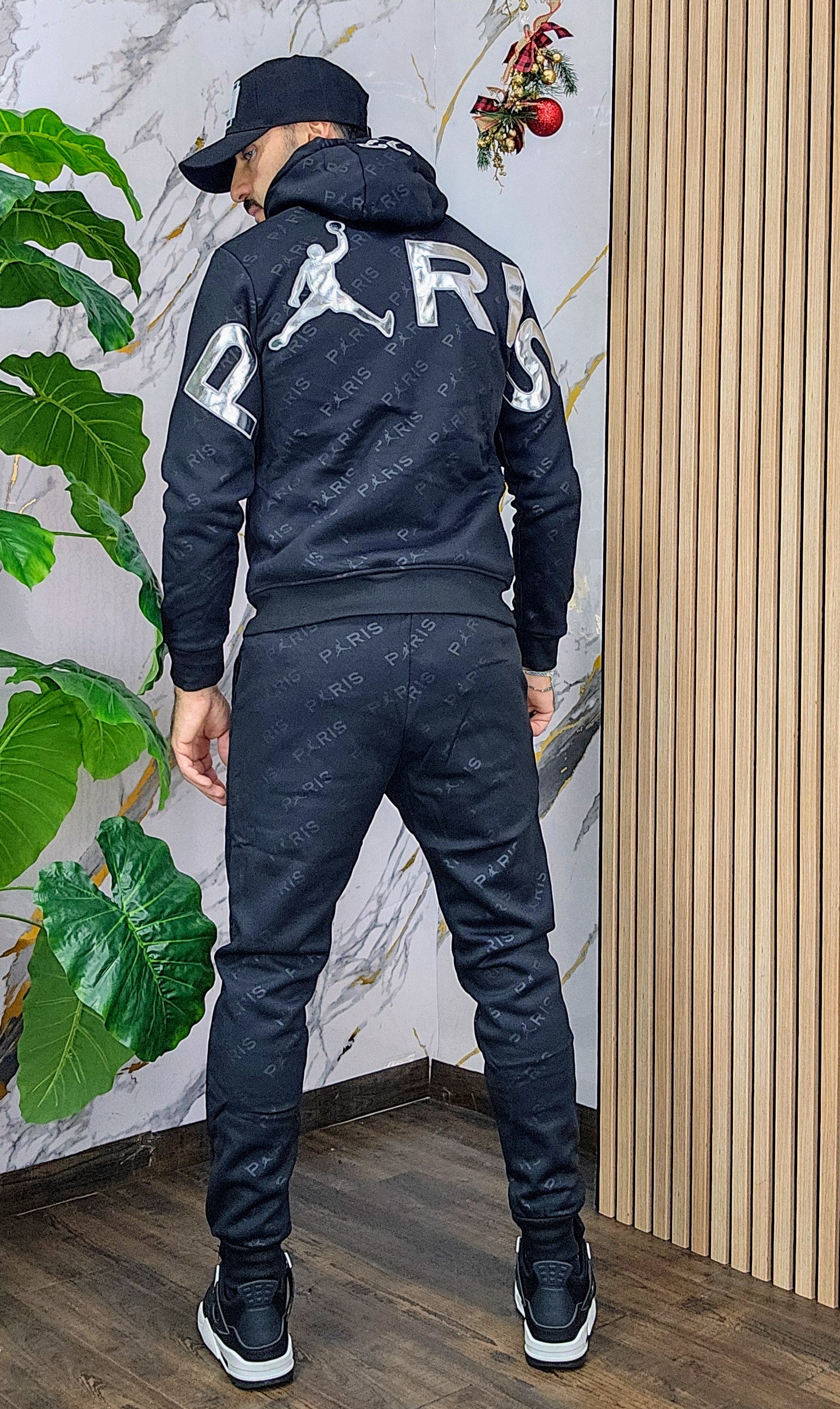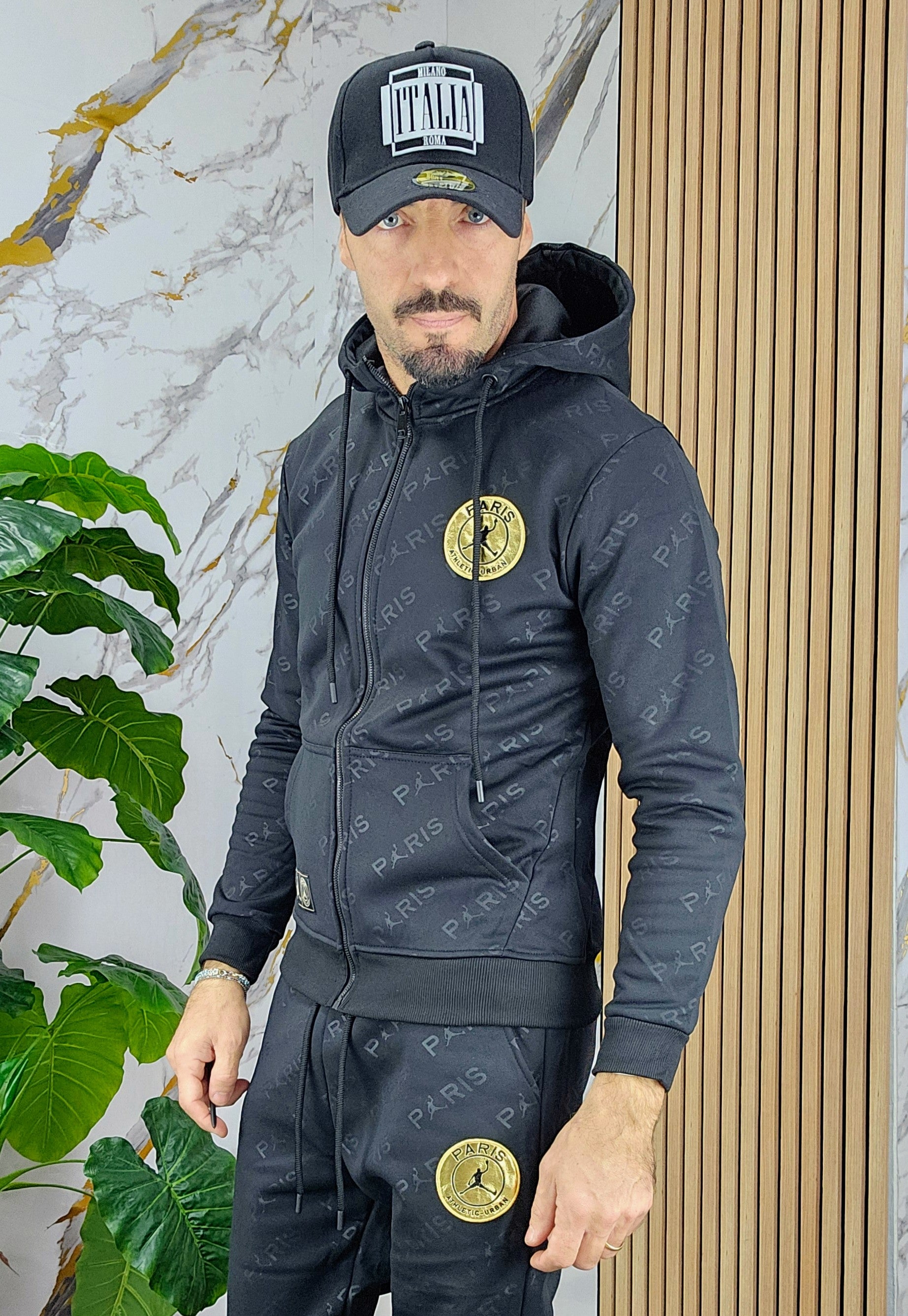 Tuta imbottita all'interno slim fit con chiusura zip centrale tasche marsupio cappuccio regolabile scritte ricucite scritte paris serigrafate su tutta la tuta pantatuta 2 tasche laterali polsino alla caviglia dalla S alla XXL, il modello in foto è alto 1.82x76kg è indossa una taglia S.Prodotto Made in Italy