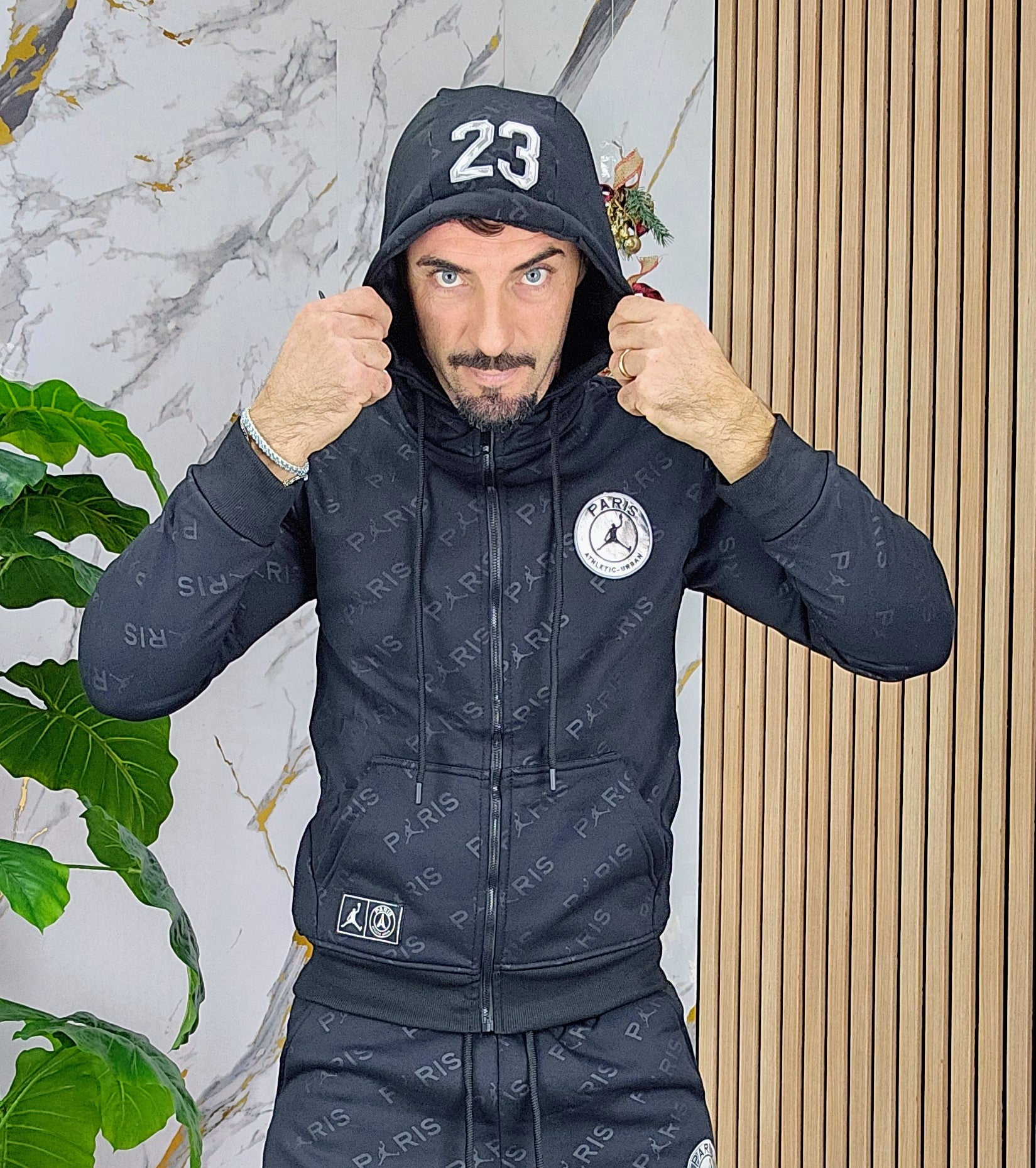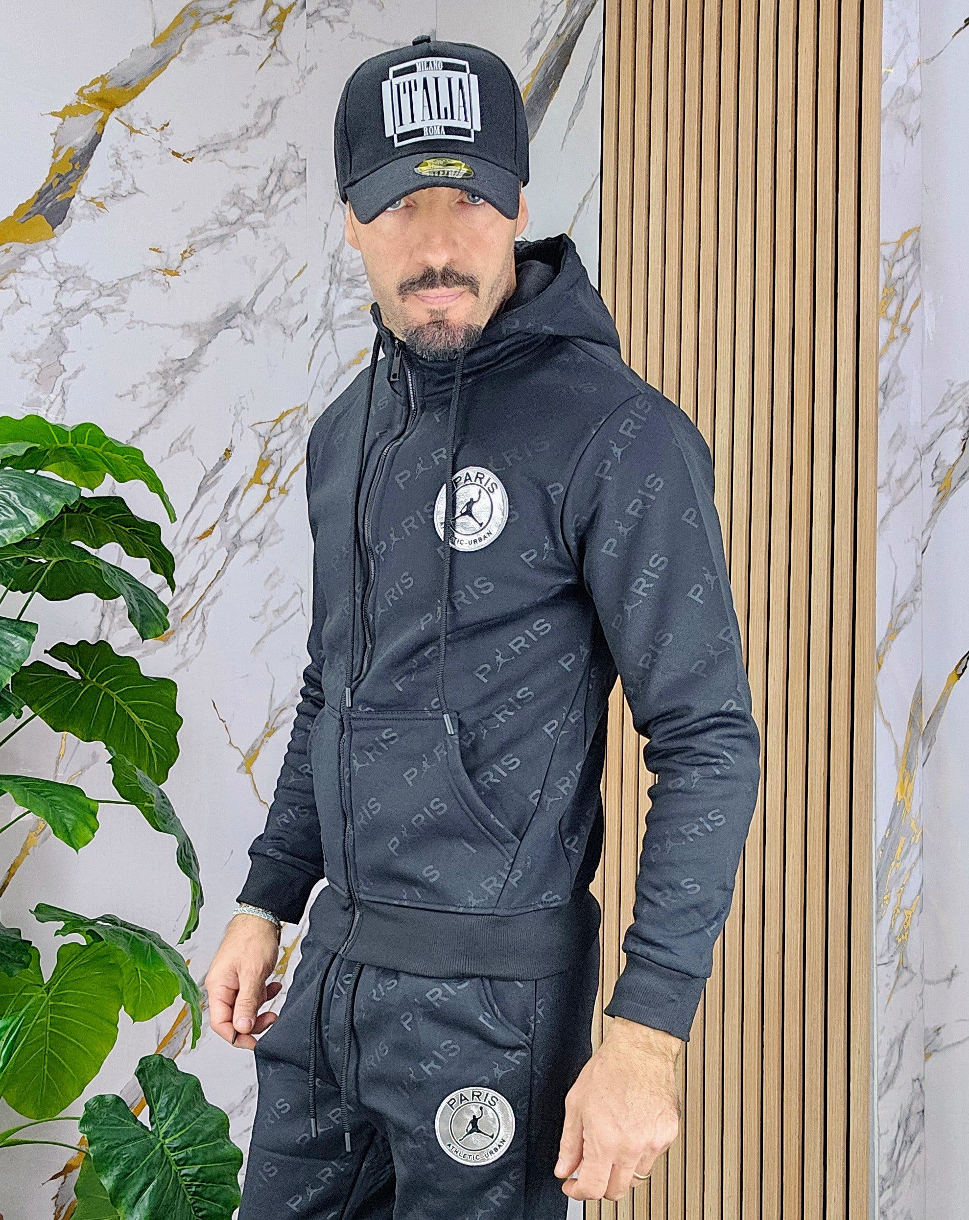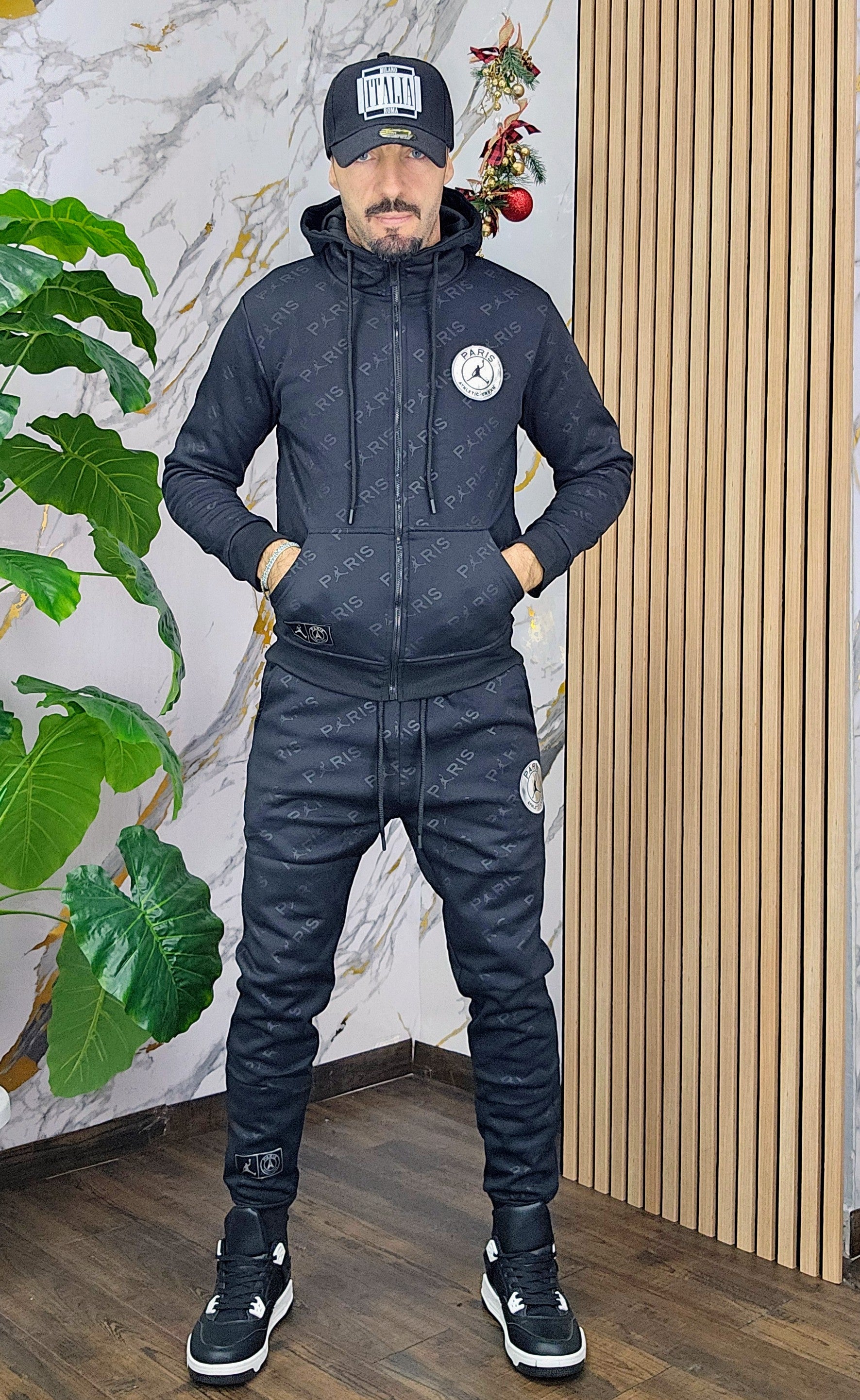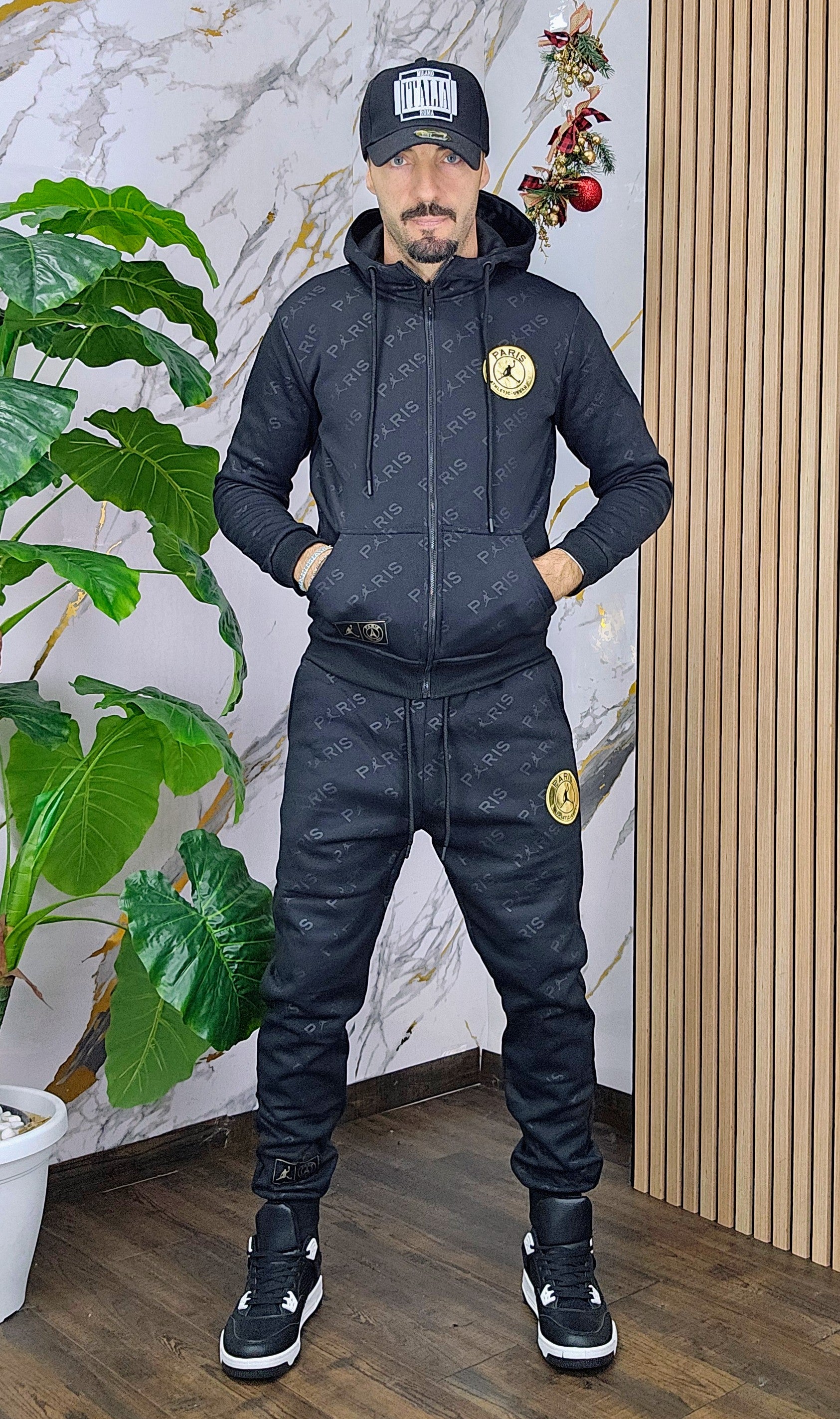 Tuta imbottita all'interno slim fit con chiusura zip centrale tasche marsupio cappuccio regolabile scritte ricucite scritte paris serigrafate su tutta la tuta pantatuta 2 tasche laterali polsino alla caviglia dalla S alla XXL, il modello in foto è alto 1.82x76kg è indossa una taglia S.Prodotto Made in Italy