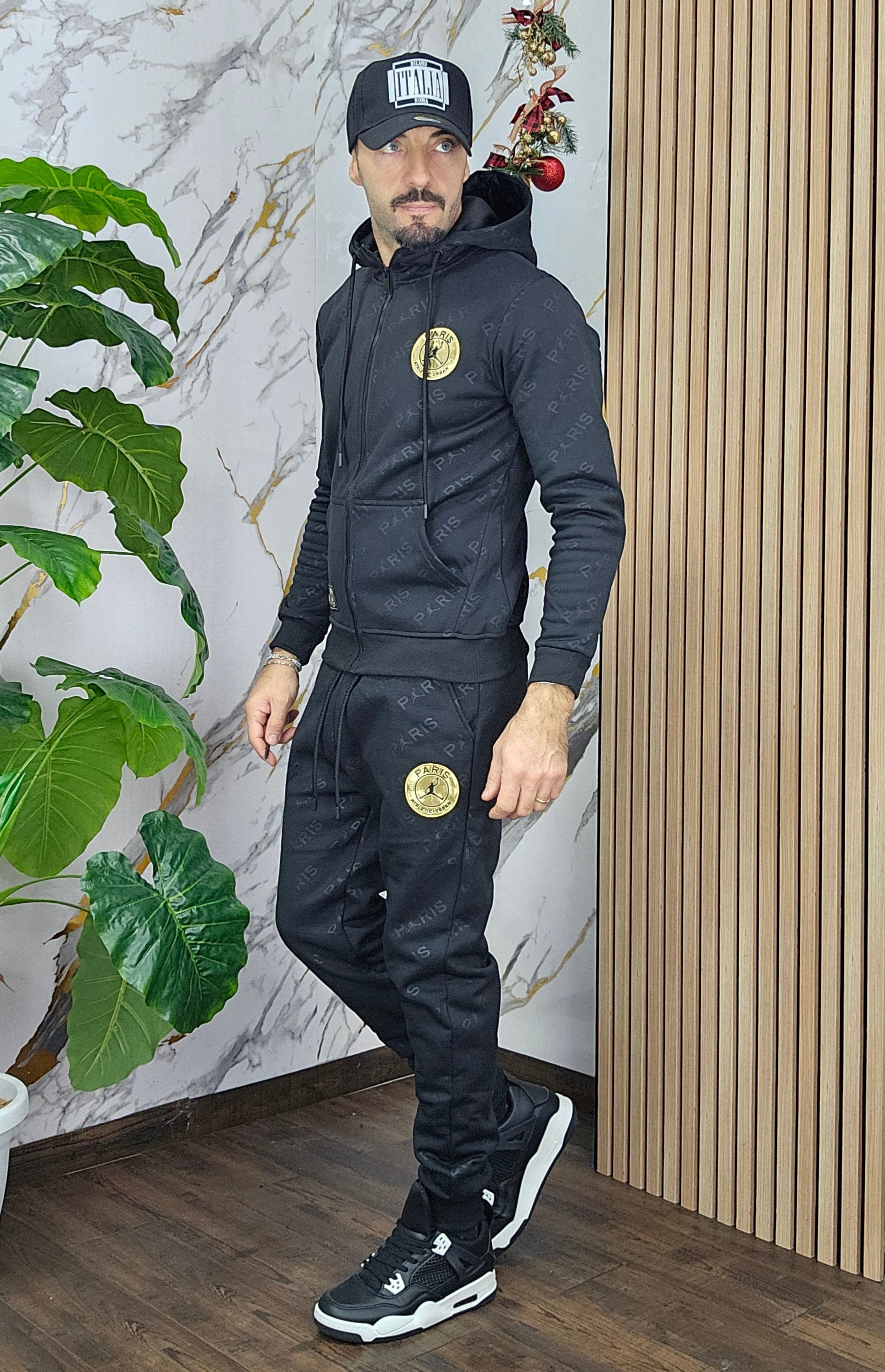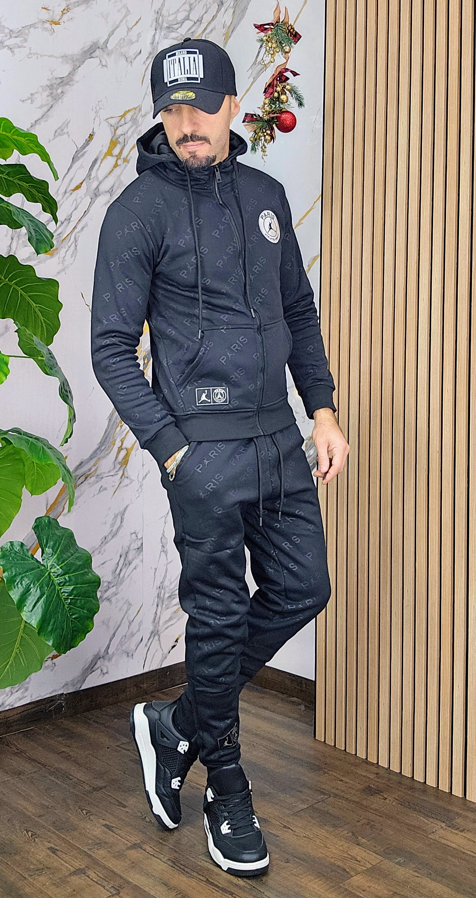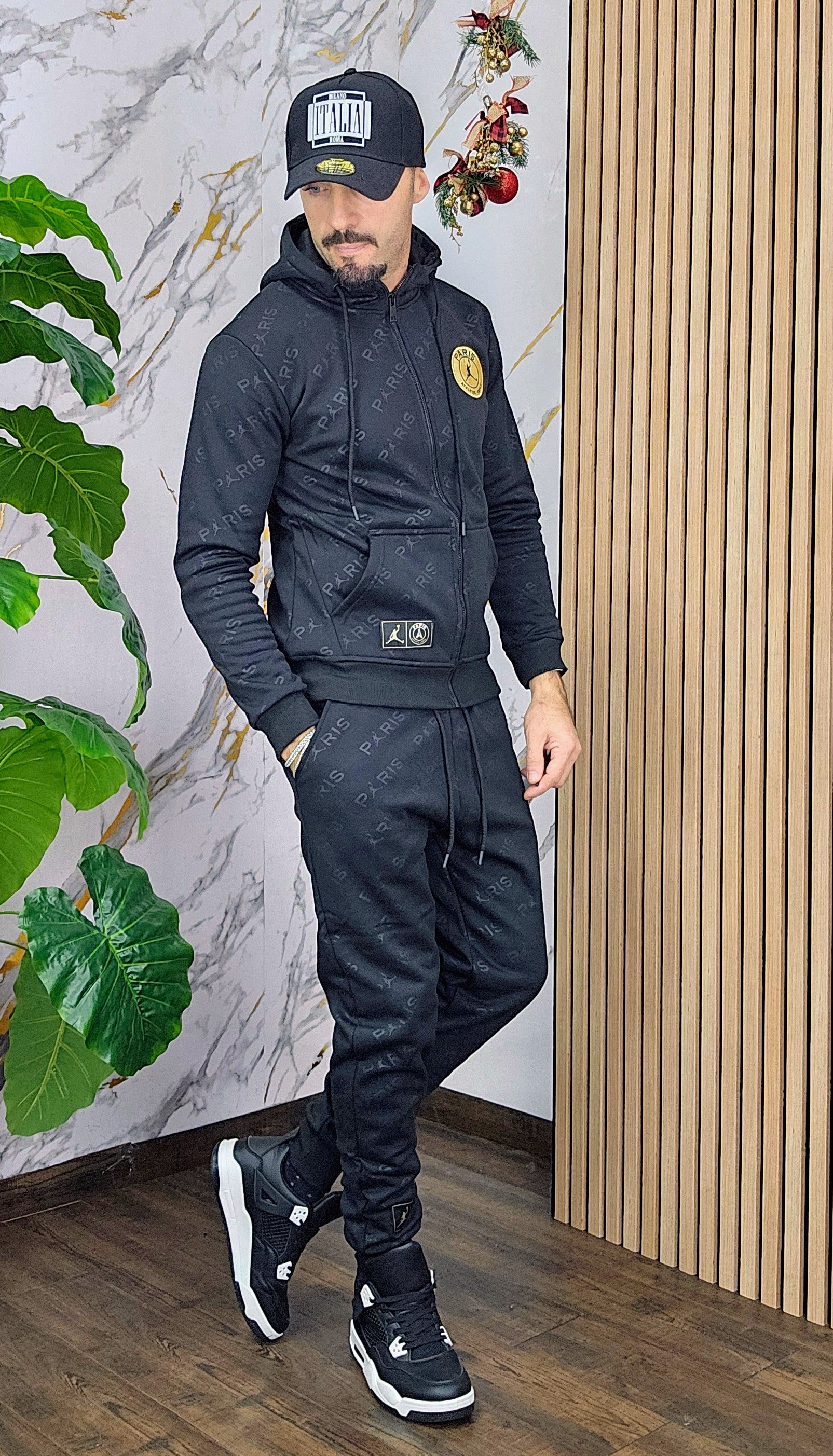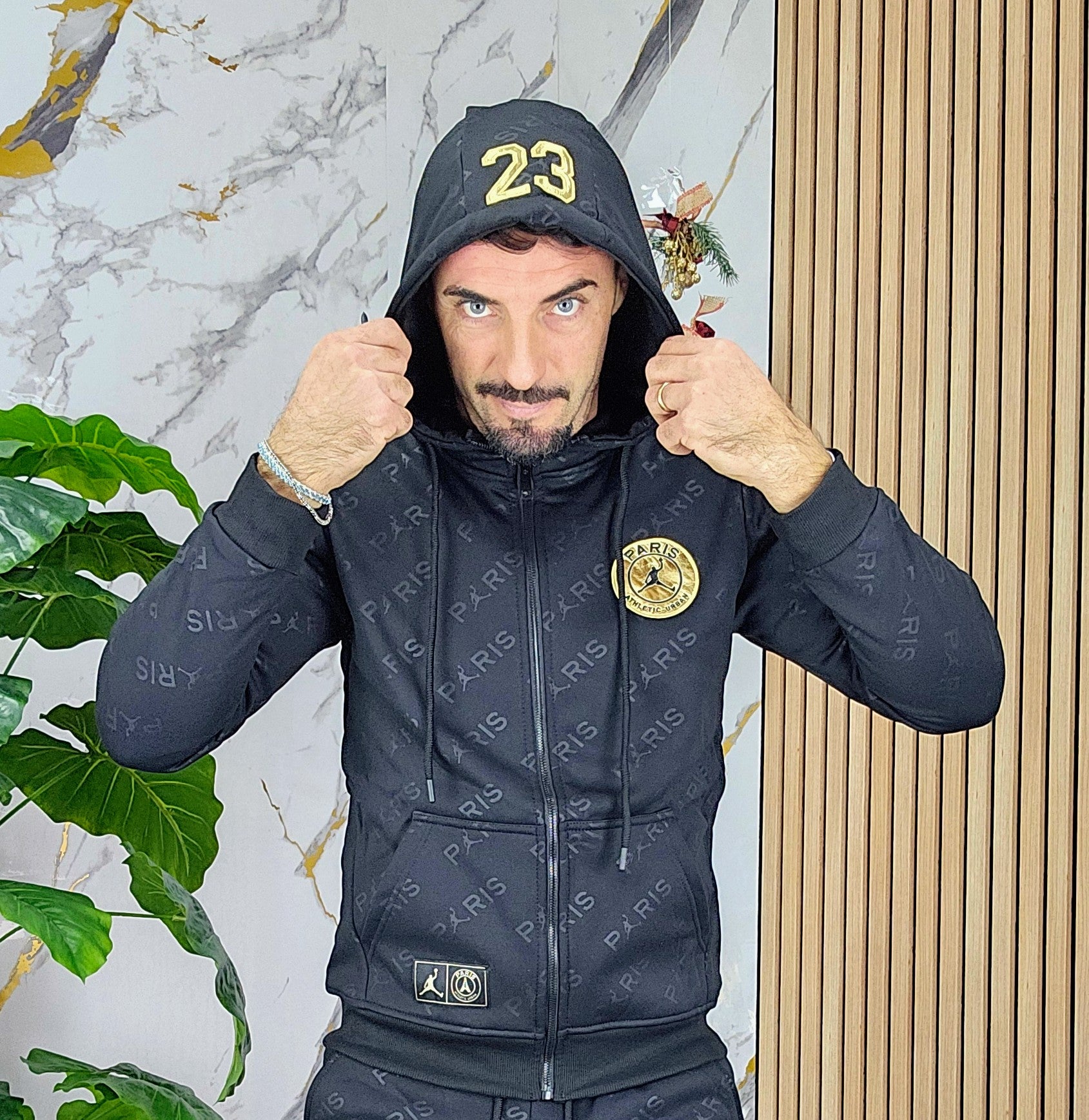 Tuta imbottita all'interno slim fit con chiusura zip centrale tasche marsupio cappuccio regolabile scritte ricucite scritte paris serigrafate su tutta la tuta pantatuta 2 tasche laterali polsino alla caviglia dalla S alla XXL, il modello in foto è alto 1.82x76kg è indossa una taglia S.Prodotto Made in Italy