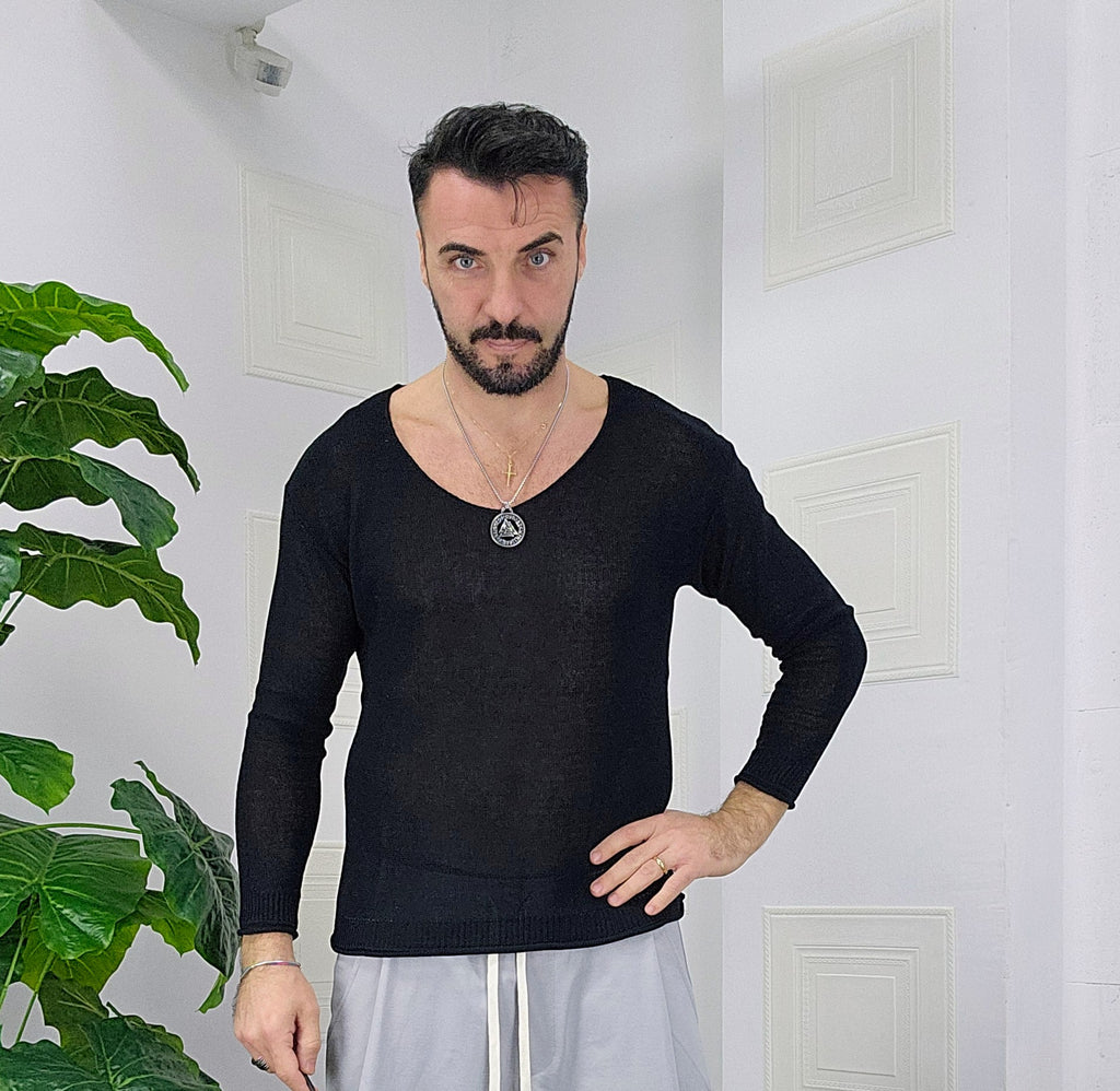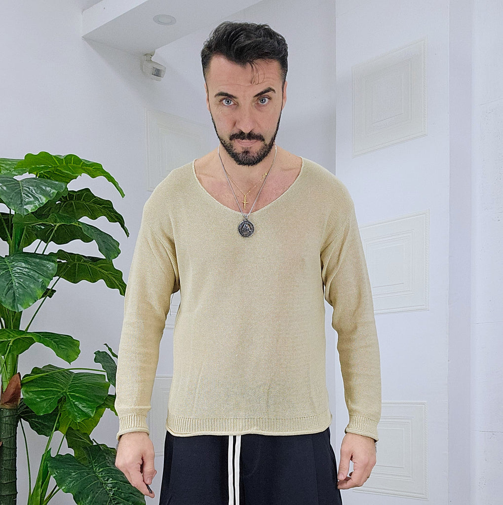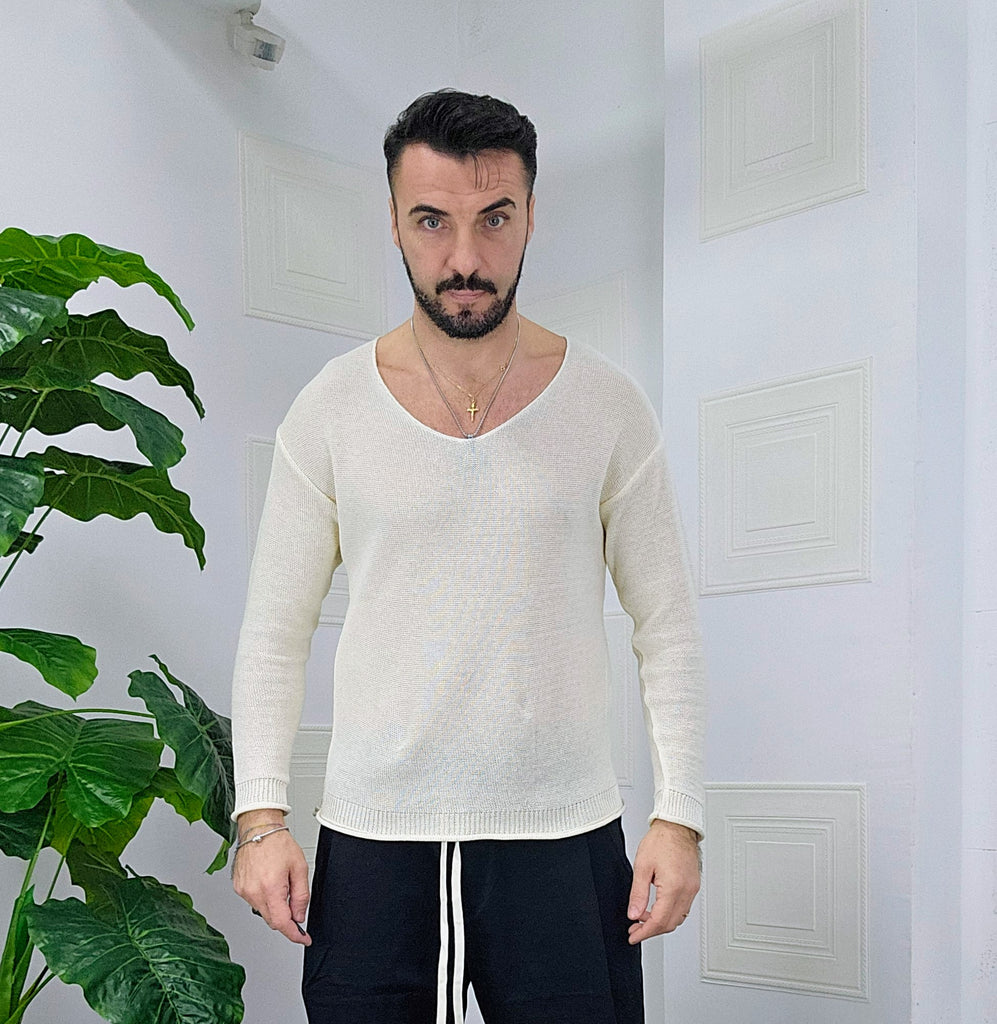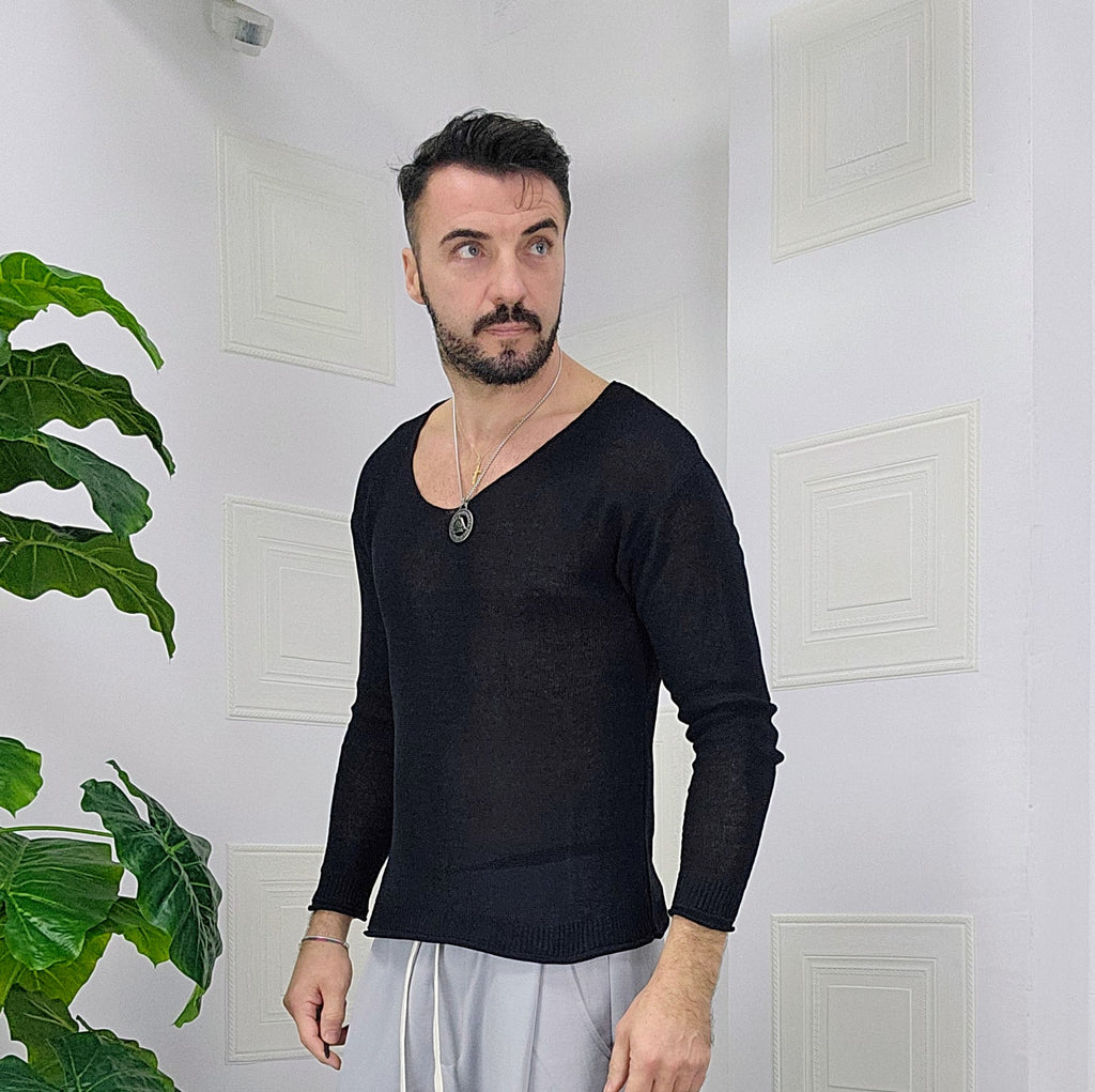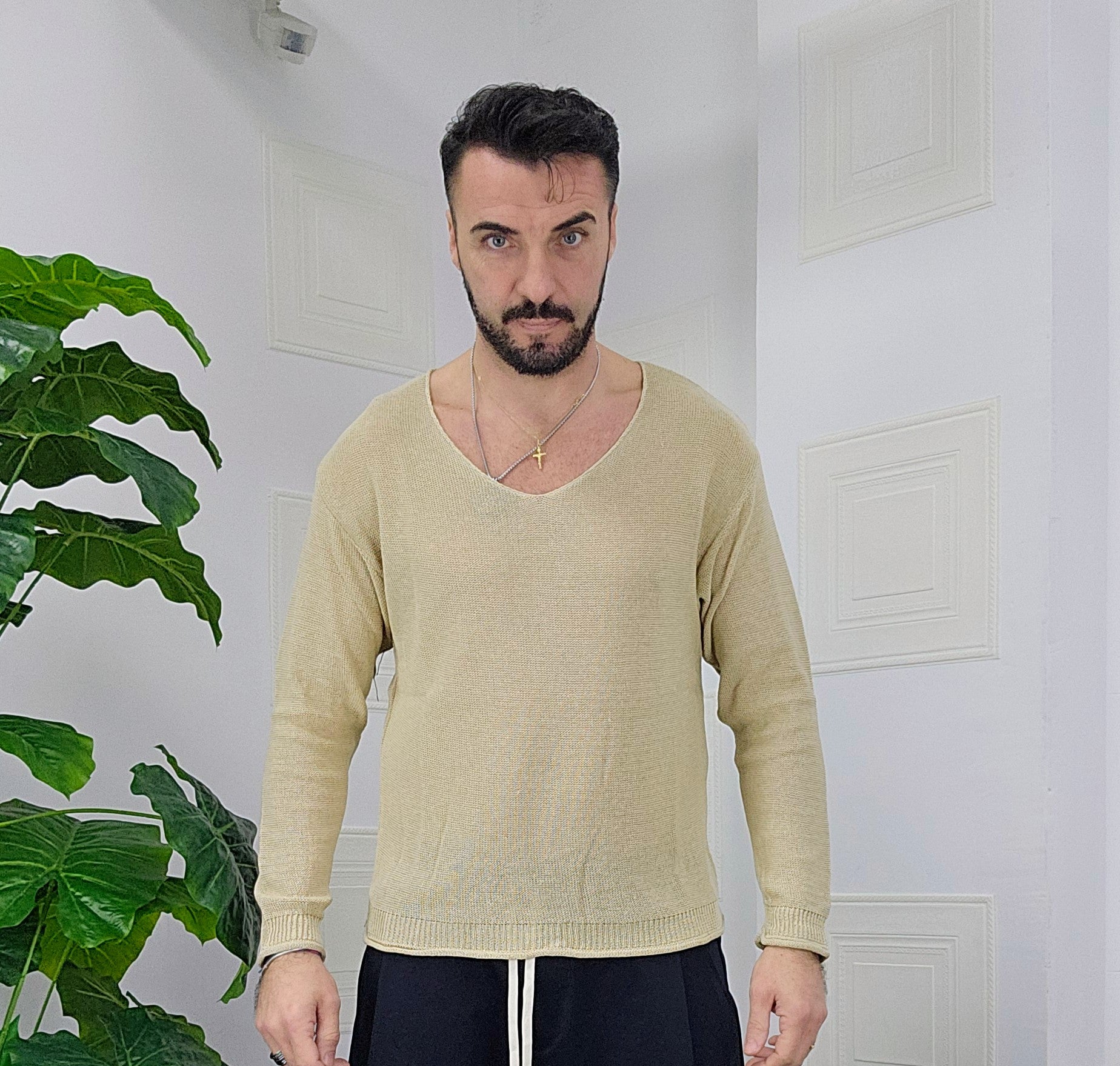 Maglia in filo con scollo a V ampio slim fit dalla S alla XXL, il modello in foto è alto 1.82x76kg è indossa una taglia M.Prodotto Made in Italy