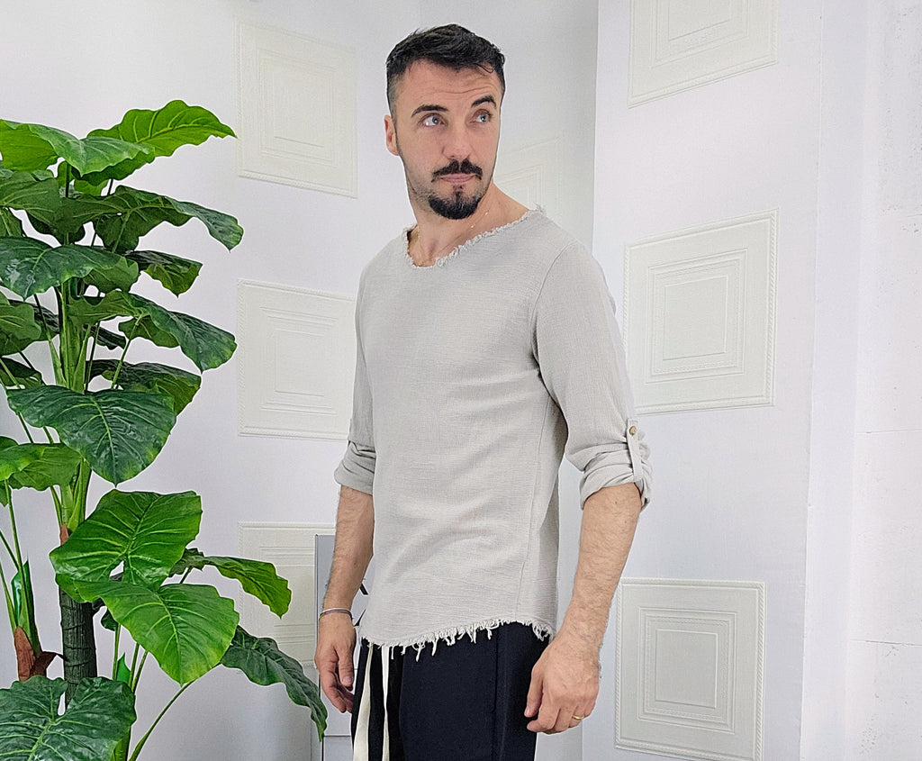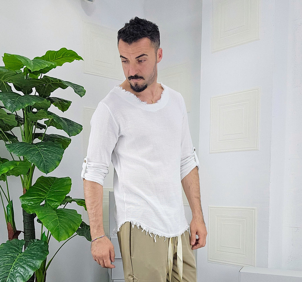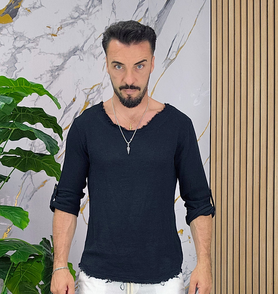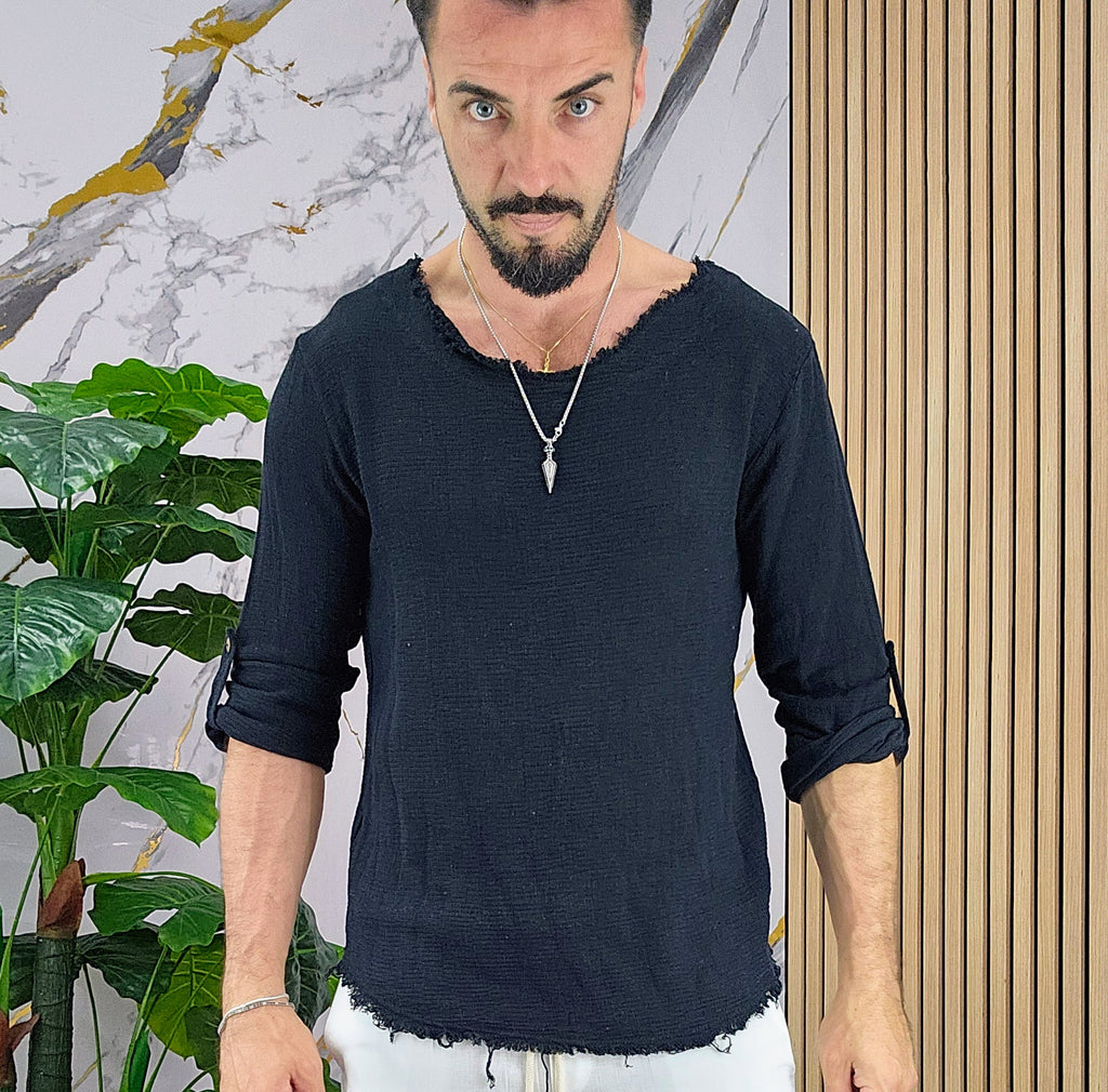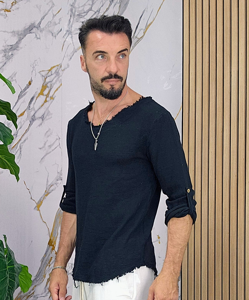 Maglia scollata con taglio vivo misto lino e cotone vestibilità comoda con chiusura laterale con bottoni in legno dalla S alla XXL, il modello in foto è alto 1.82x76kg è indossa una taglia S.Prodotto Made in Italy