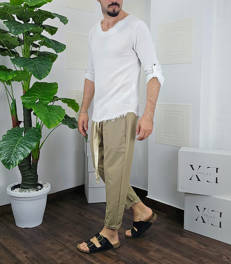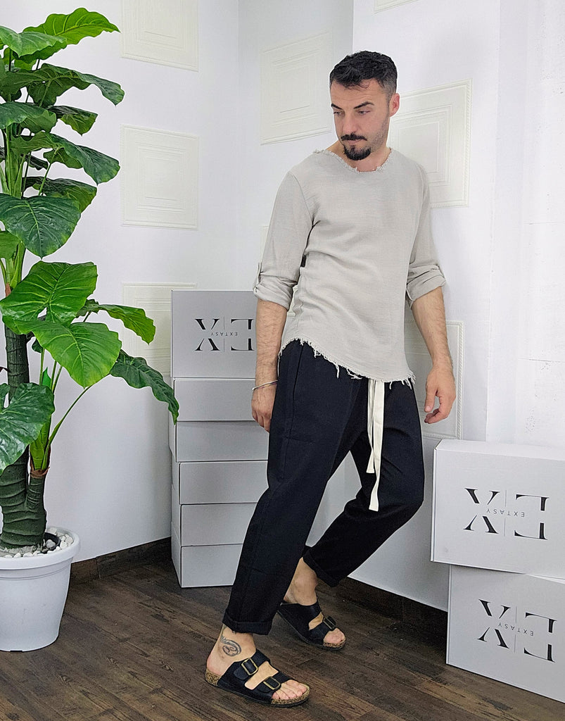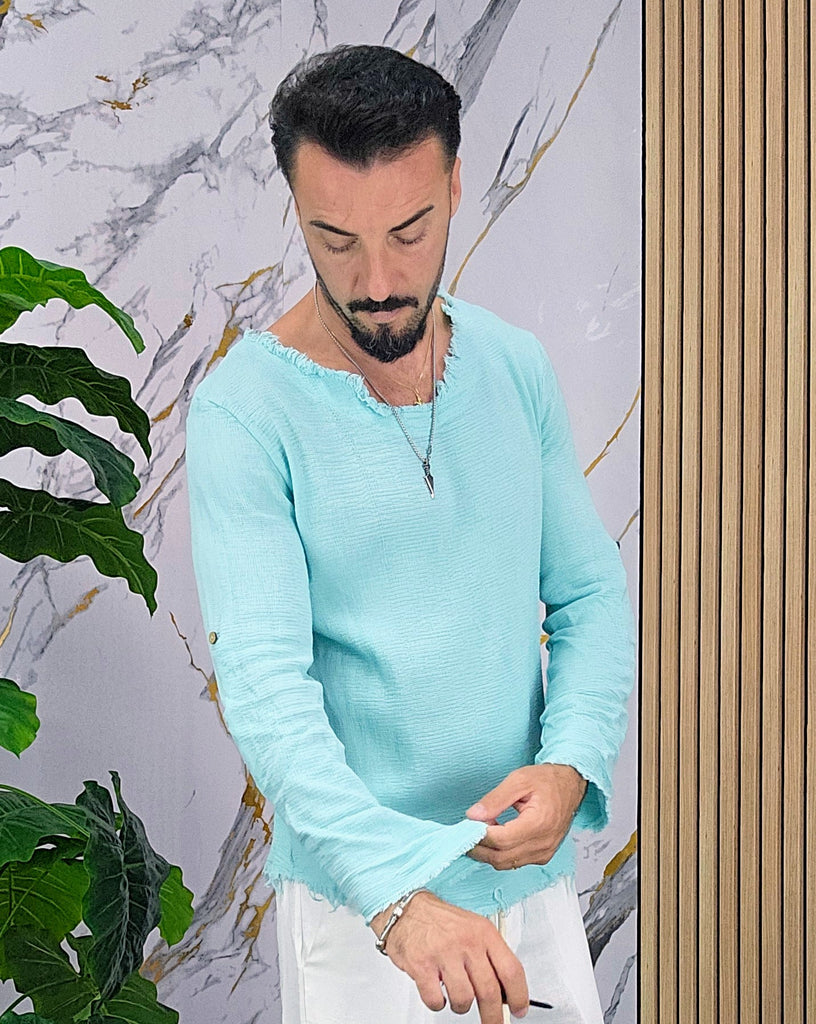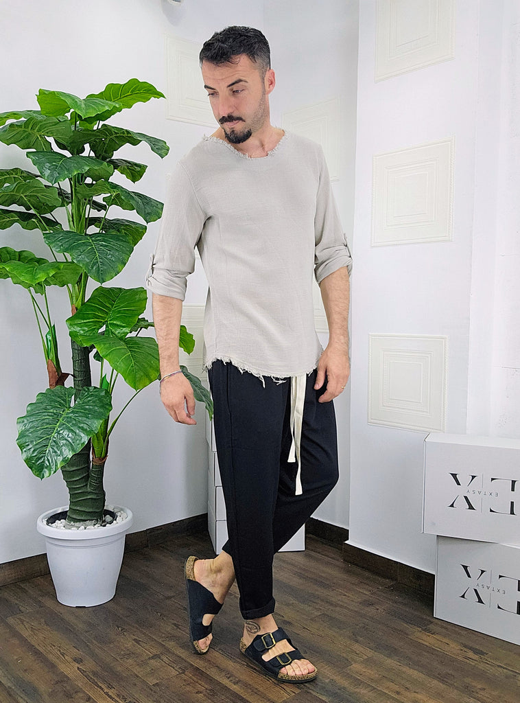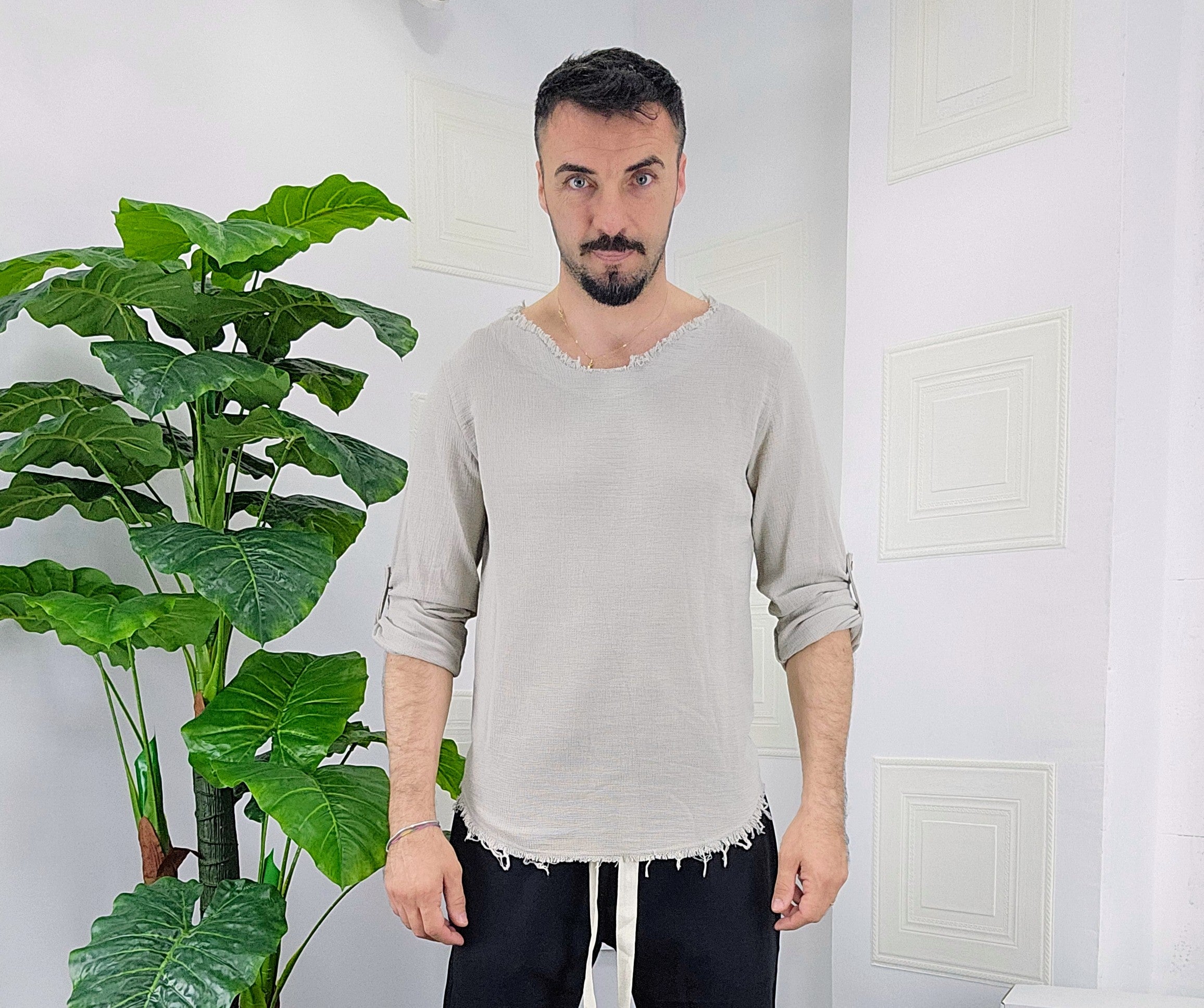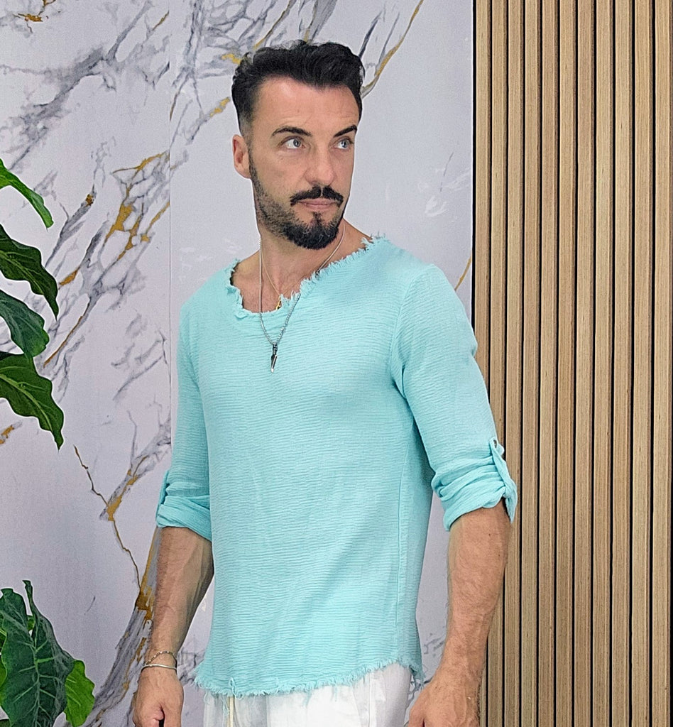 Maglia scollata con taglio vivo misto lino e cotone vestibilità comoda con chiusura laterale con bottoni in legno dalla S alla XXL, il modello in foto è alto 1.82x76kg è indossa una taglia S.Prodotto Made in Italy