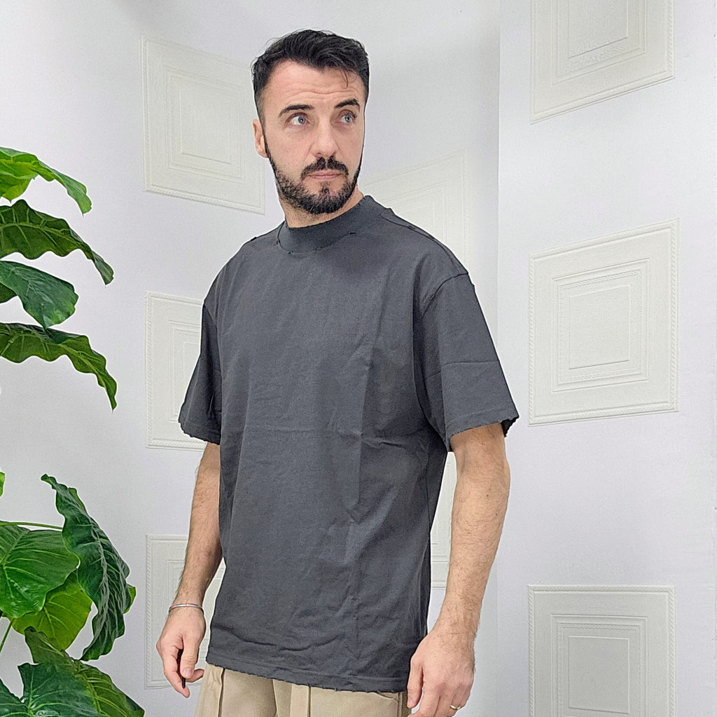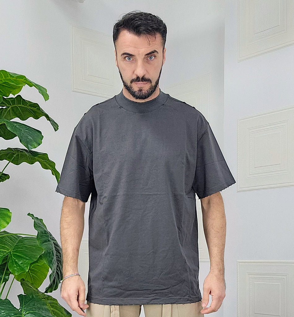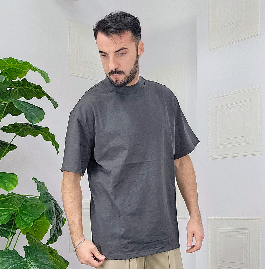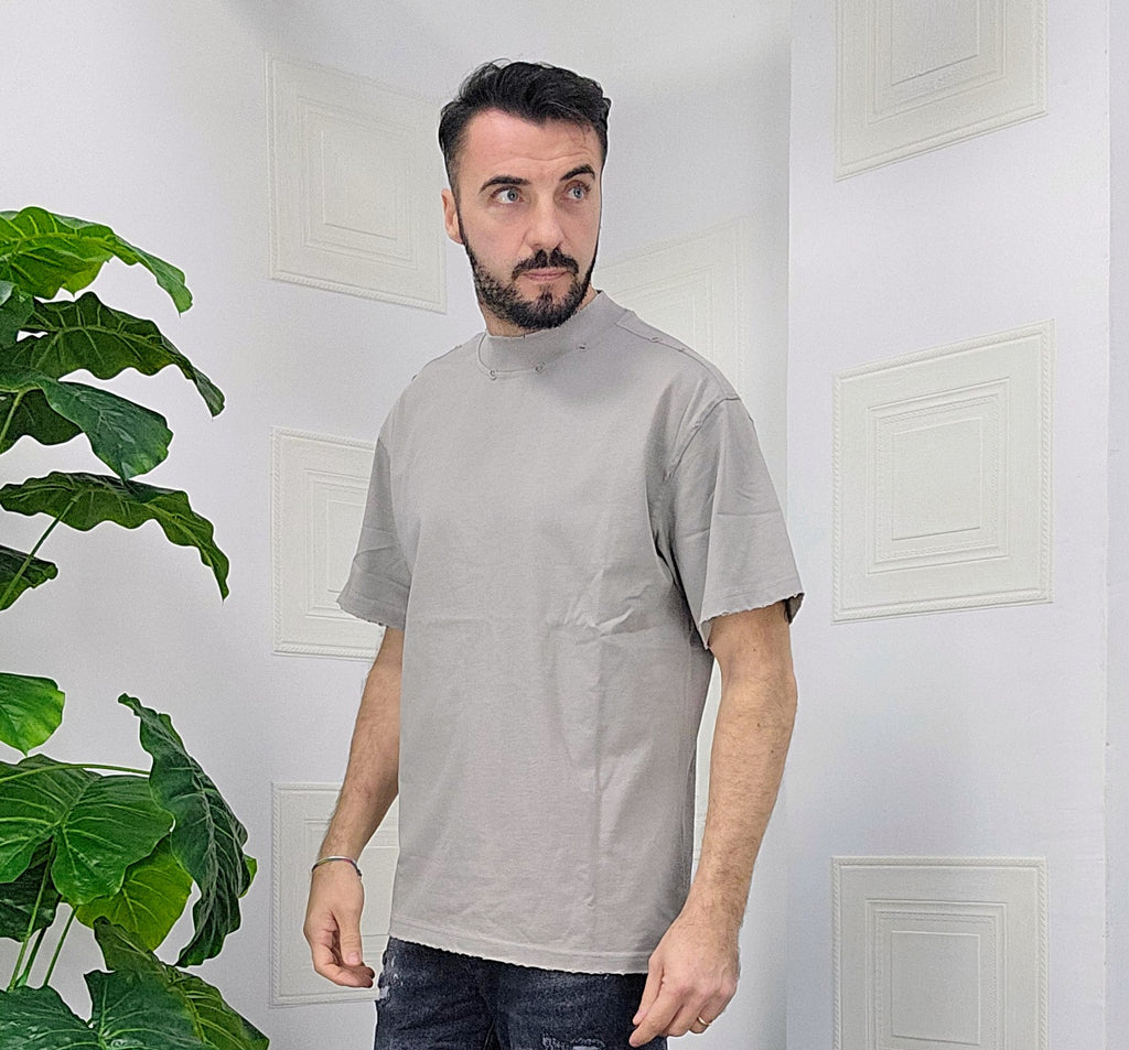 Maglia 100% cotone elastica calzata over size con rotture foderate a laser sia sul collo sia sul fondo e alle braccia dalla S alla XL, il modello in foto è alto 1.82x76kg è indossa una taglia S.Prodotto Made in Italy
