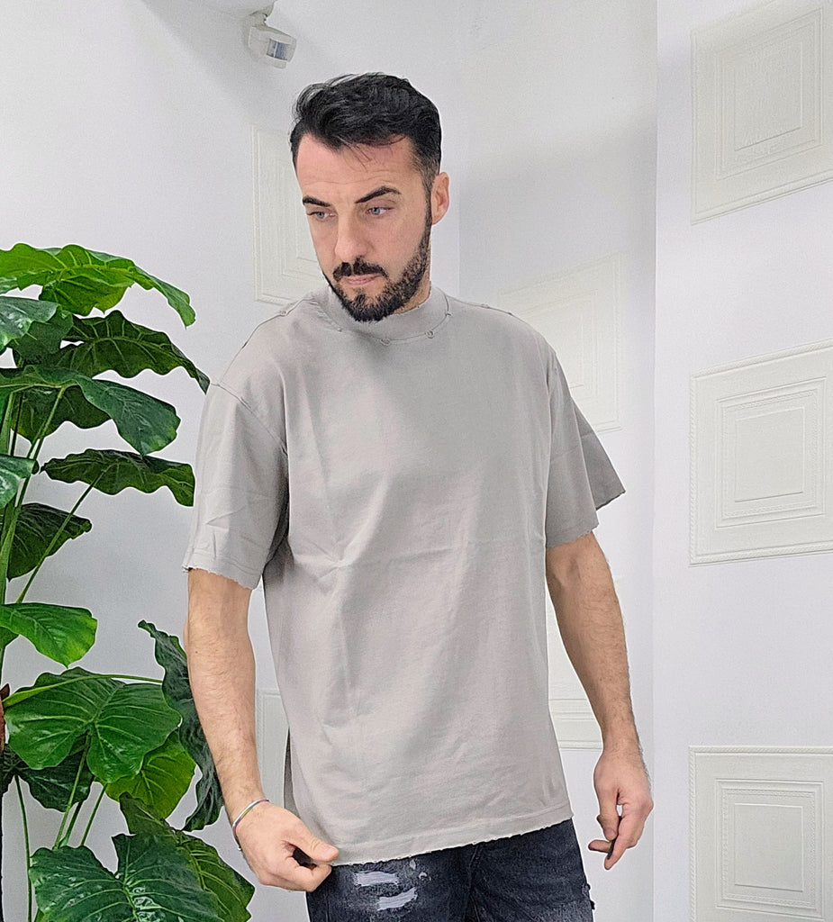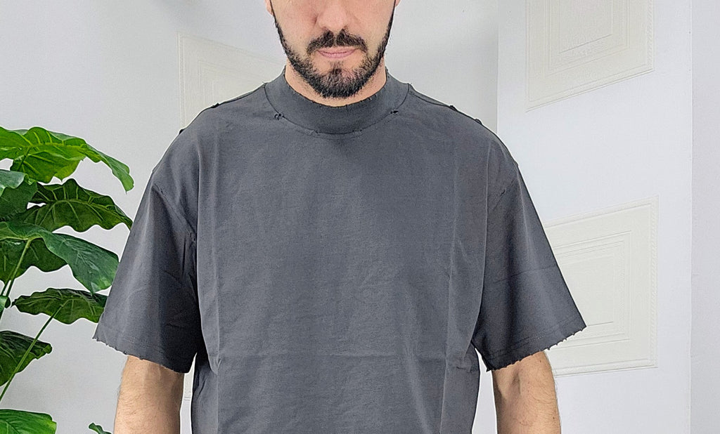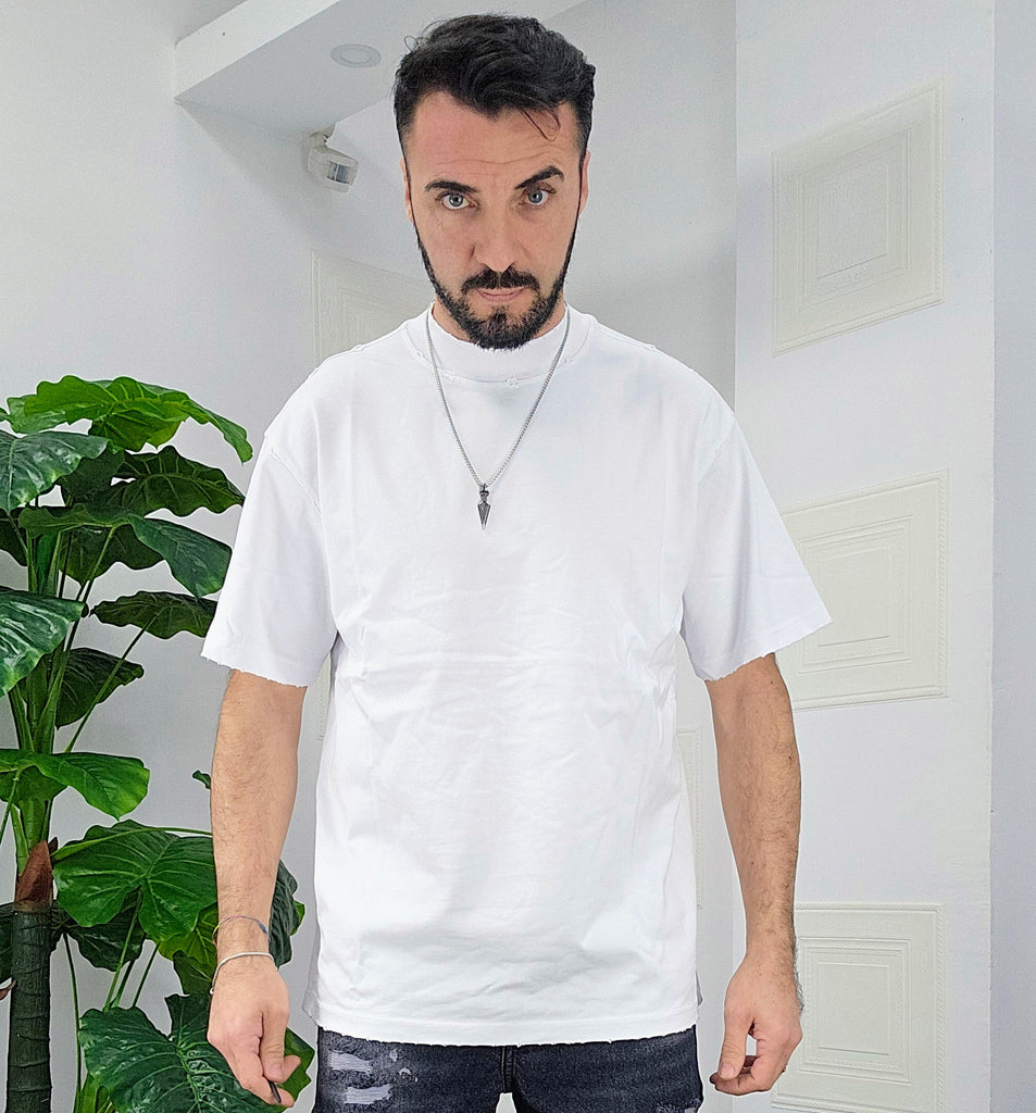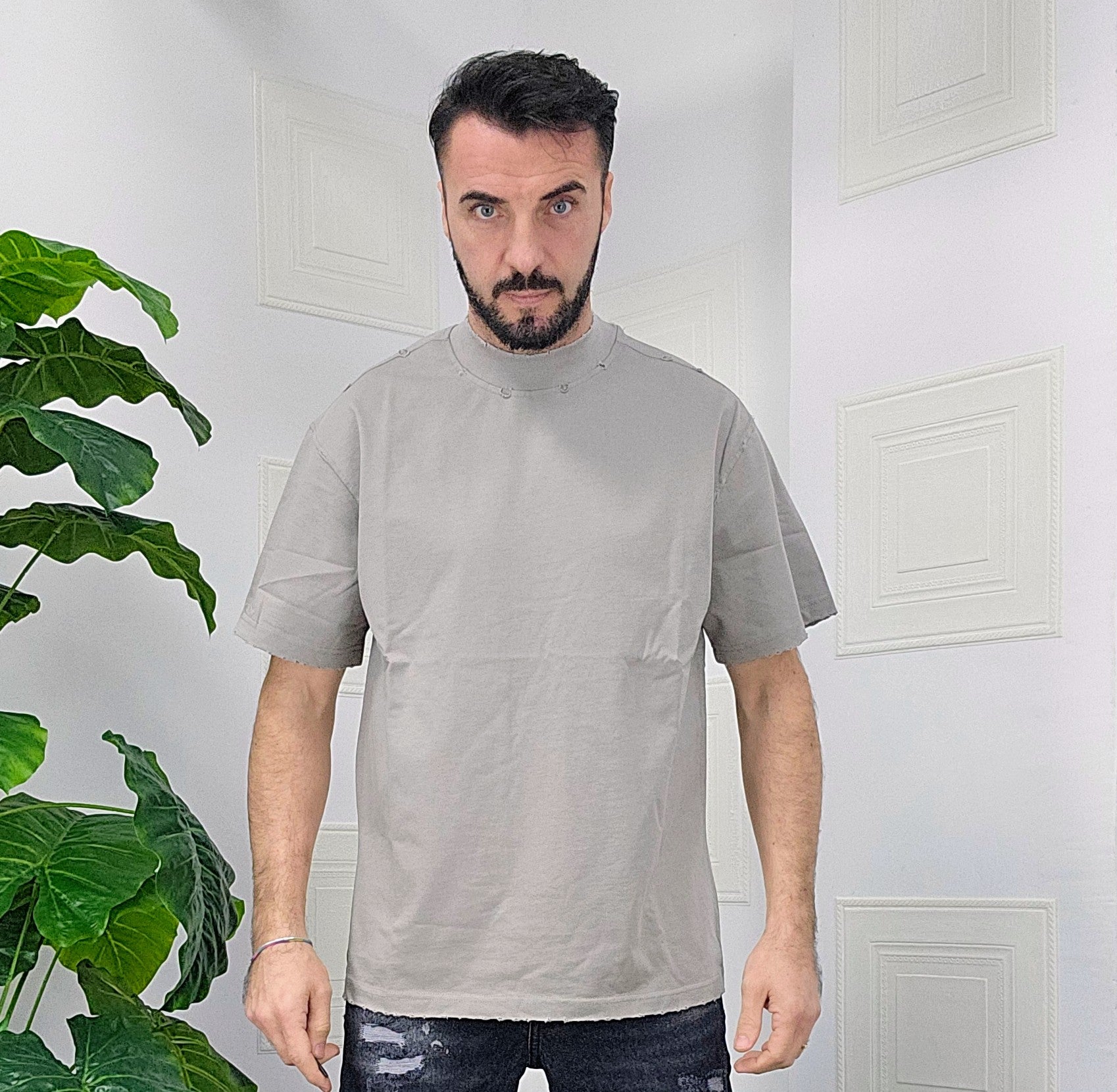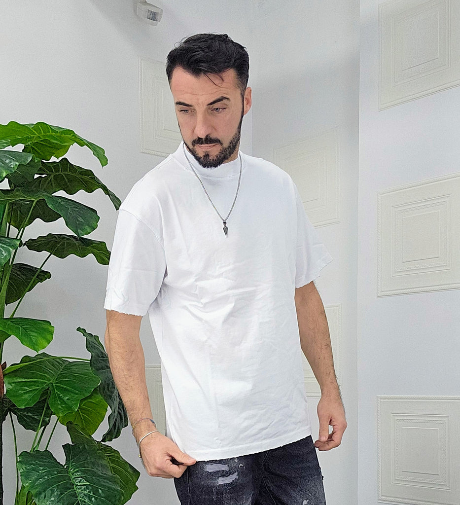 Maglia 100% cotone elastica calzata over size con rotture foderate a laser sia sul collo sia sul fondo e alle braccia dalla S alla XL, il modello in foto è alto 1.82x76kg è indossa una taglia S.Prodotto Made in Italy