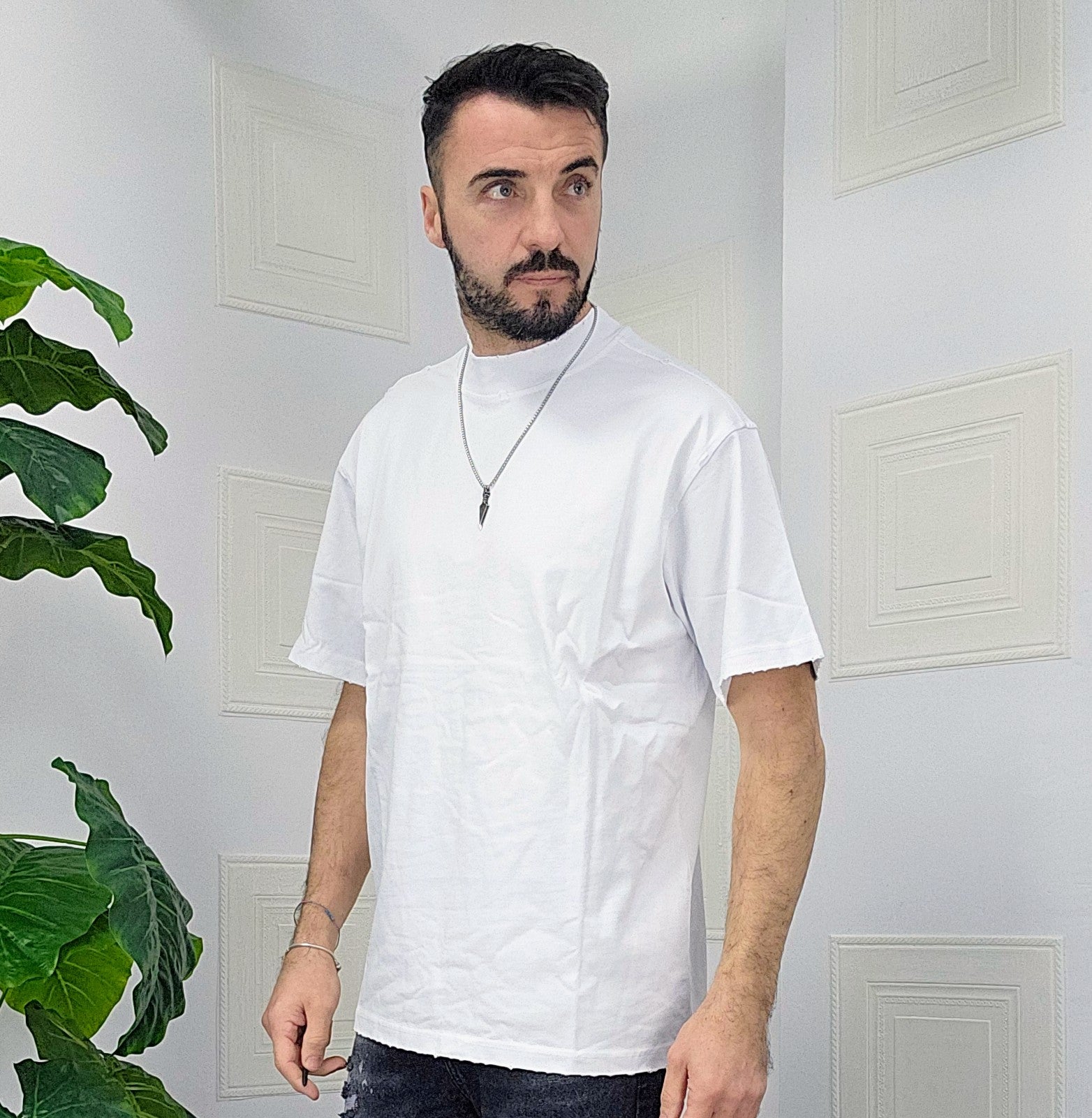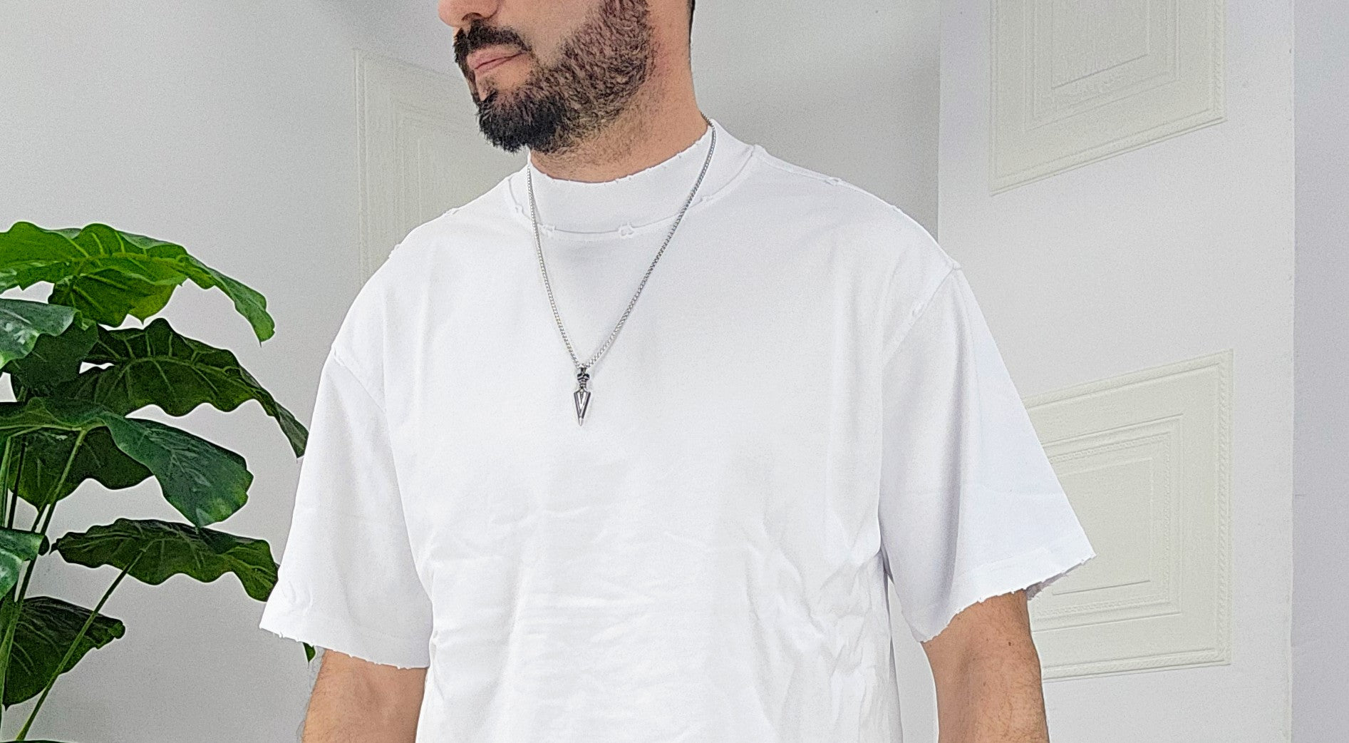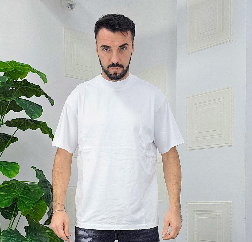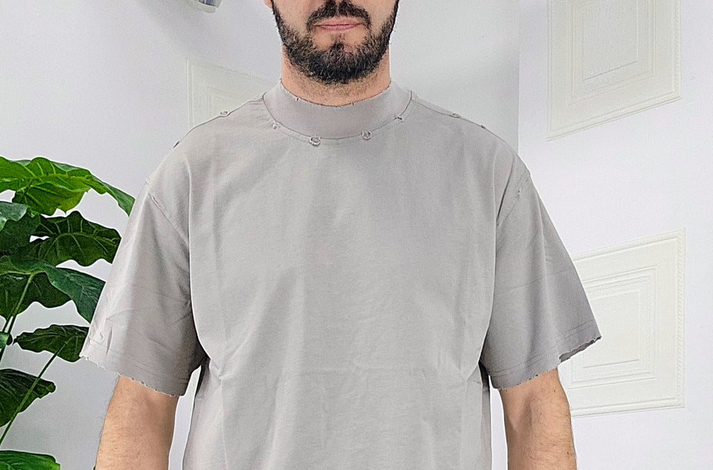 Maglia 100% cotone elastica calzata over size con rotture foderate a laser sia sul collo sia sul fondo e alle braccia dalla S alla XL, il modello in foto è alto 1.82x76kg è indossa una taglia S.Prodotto Made in Italy