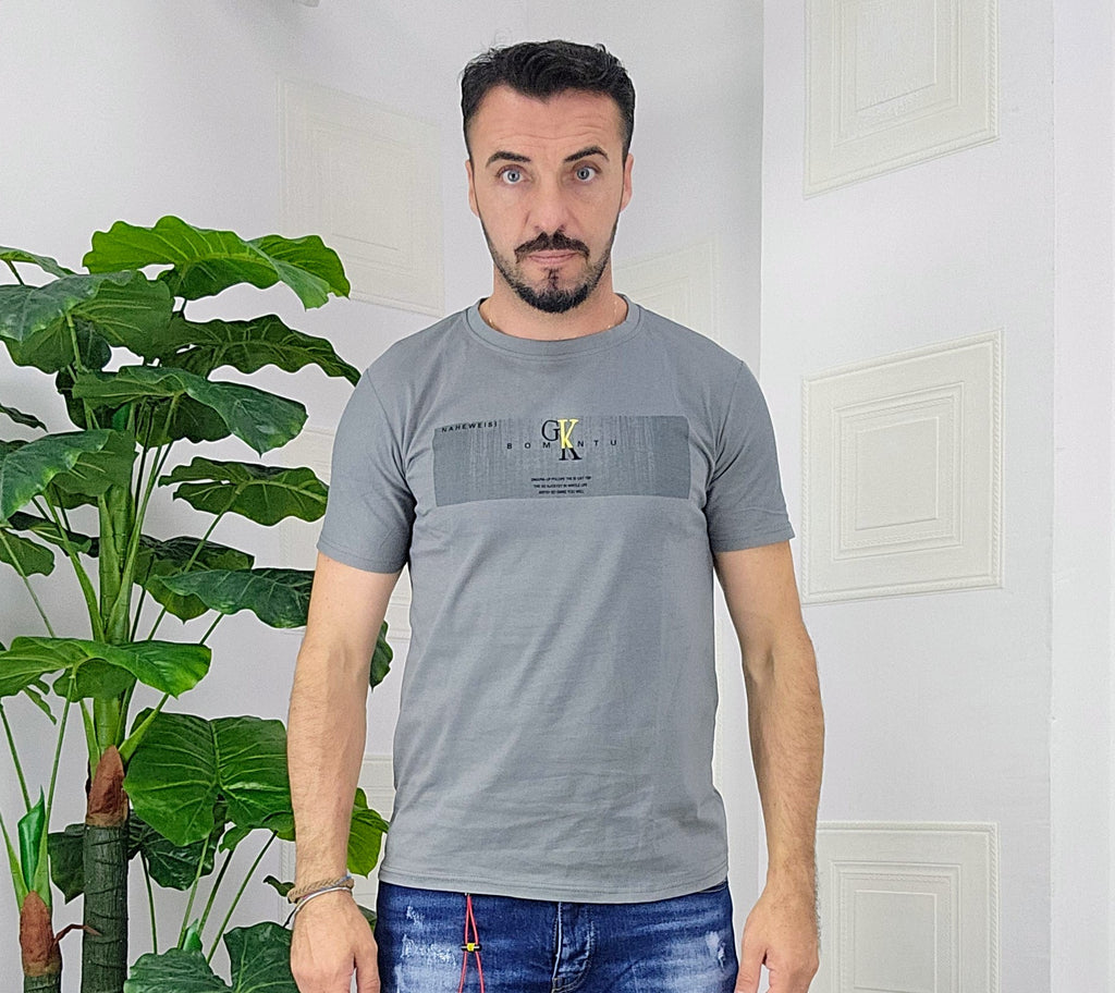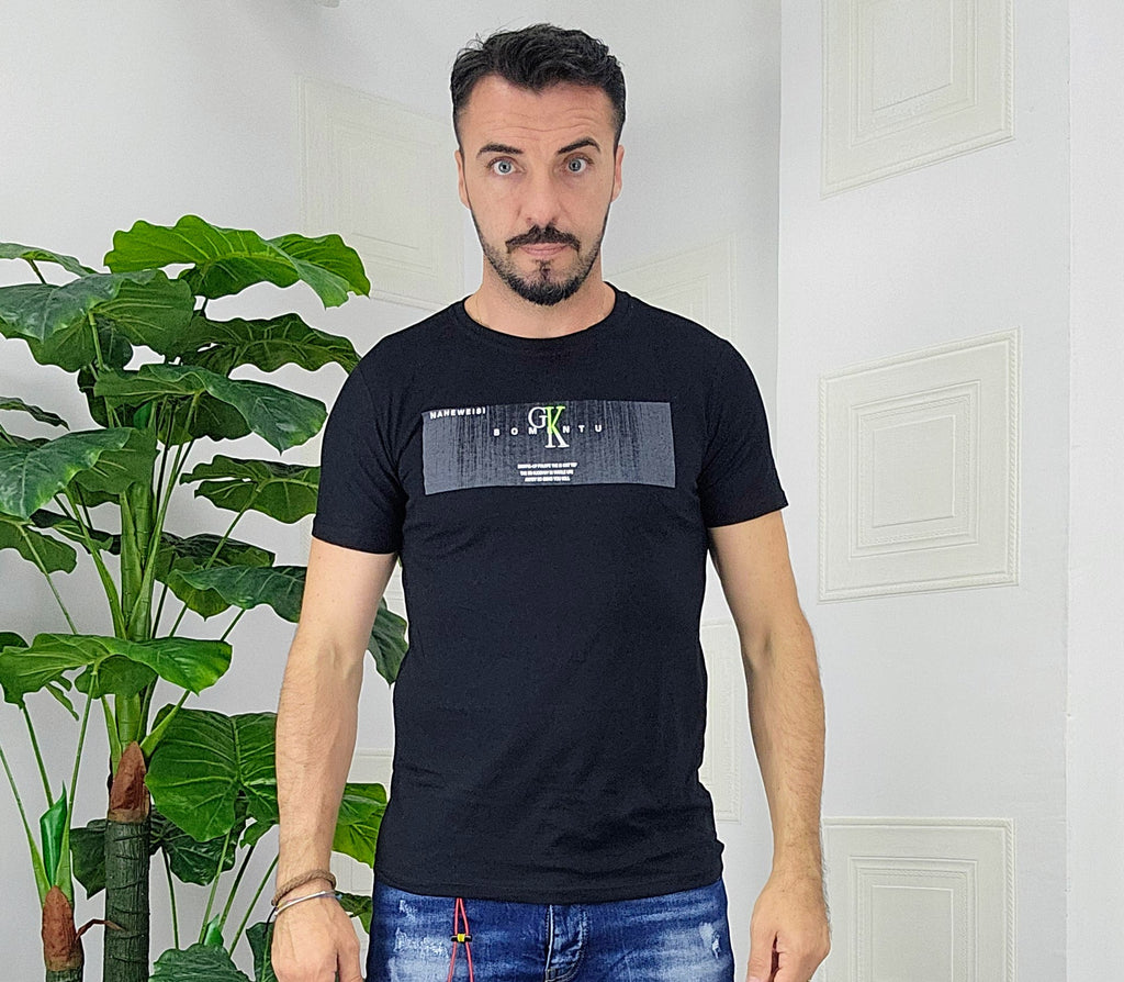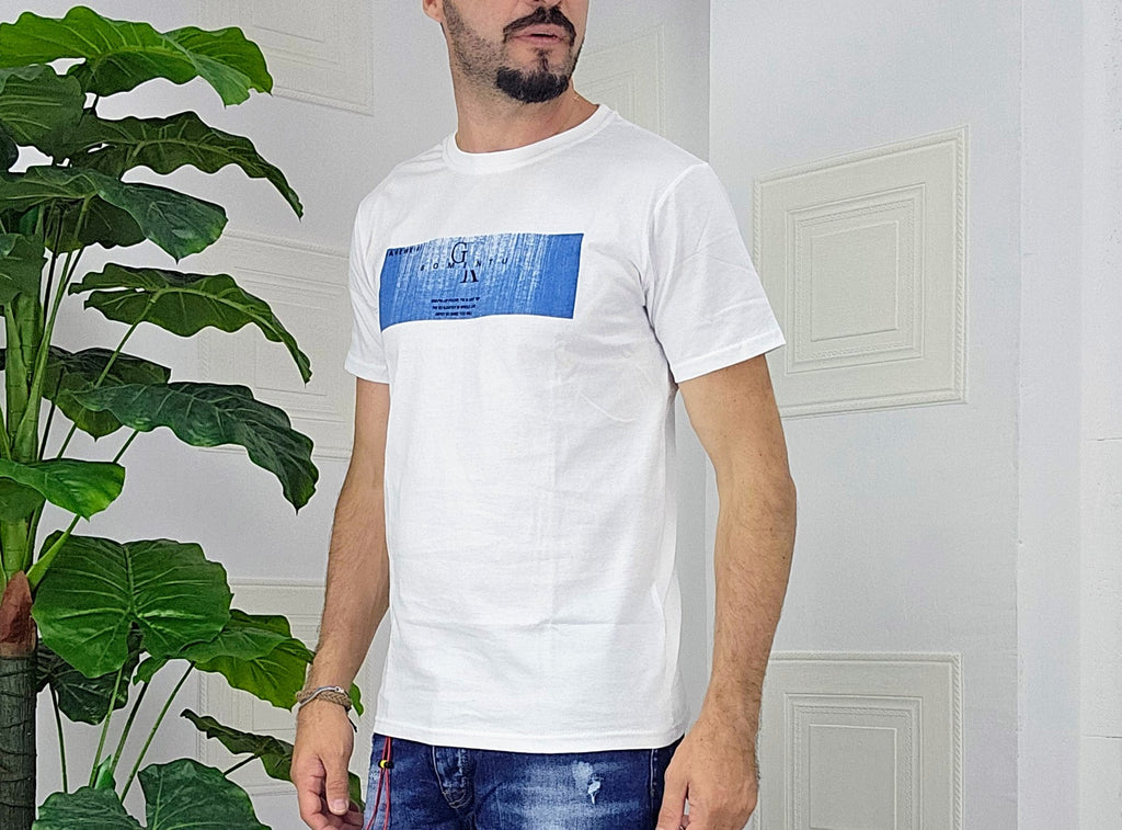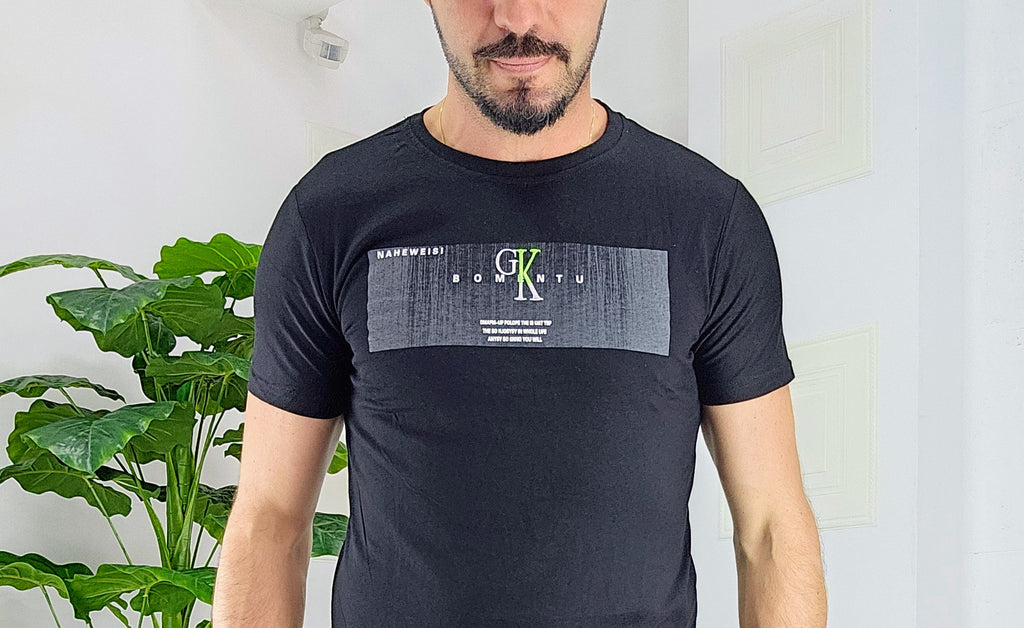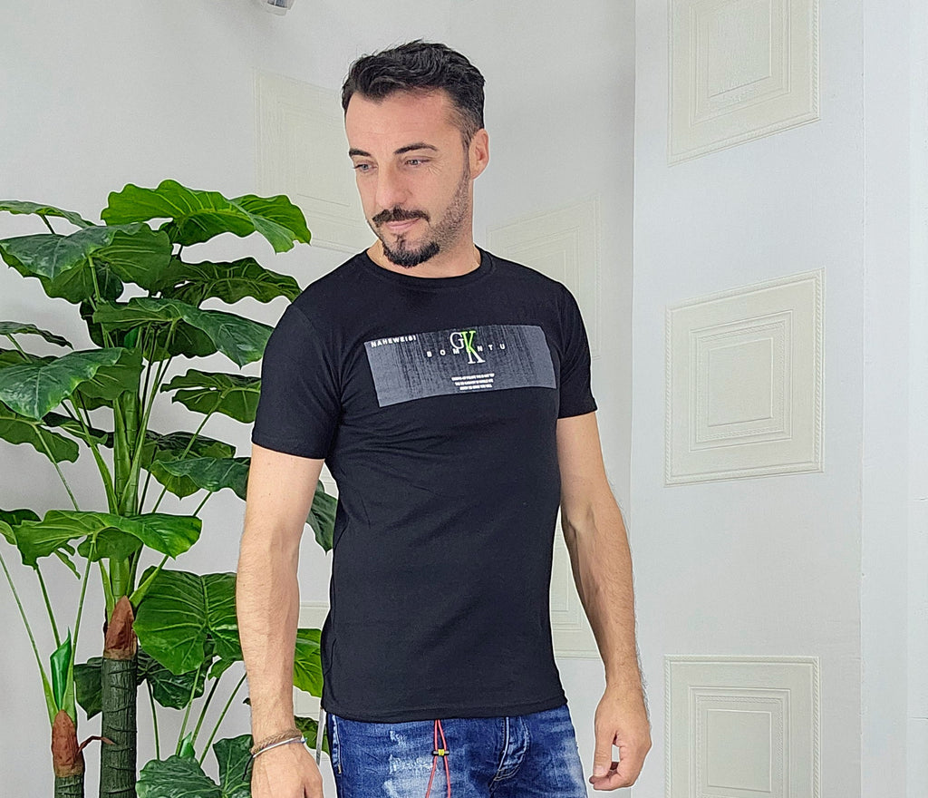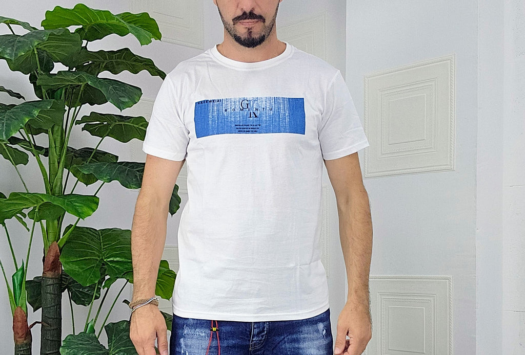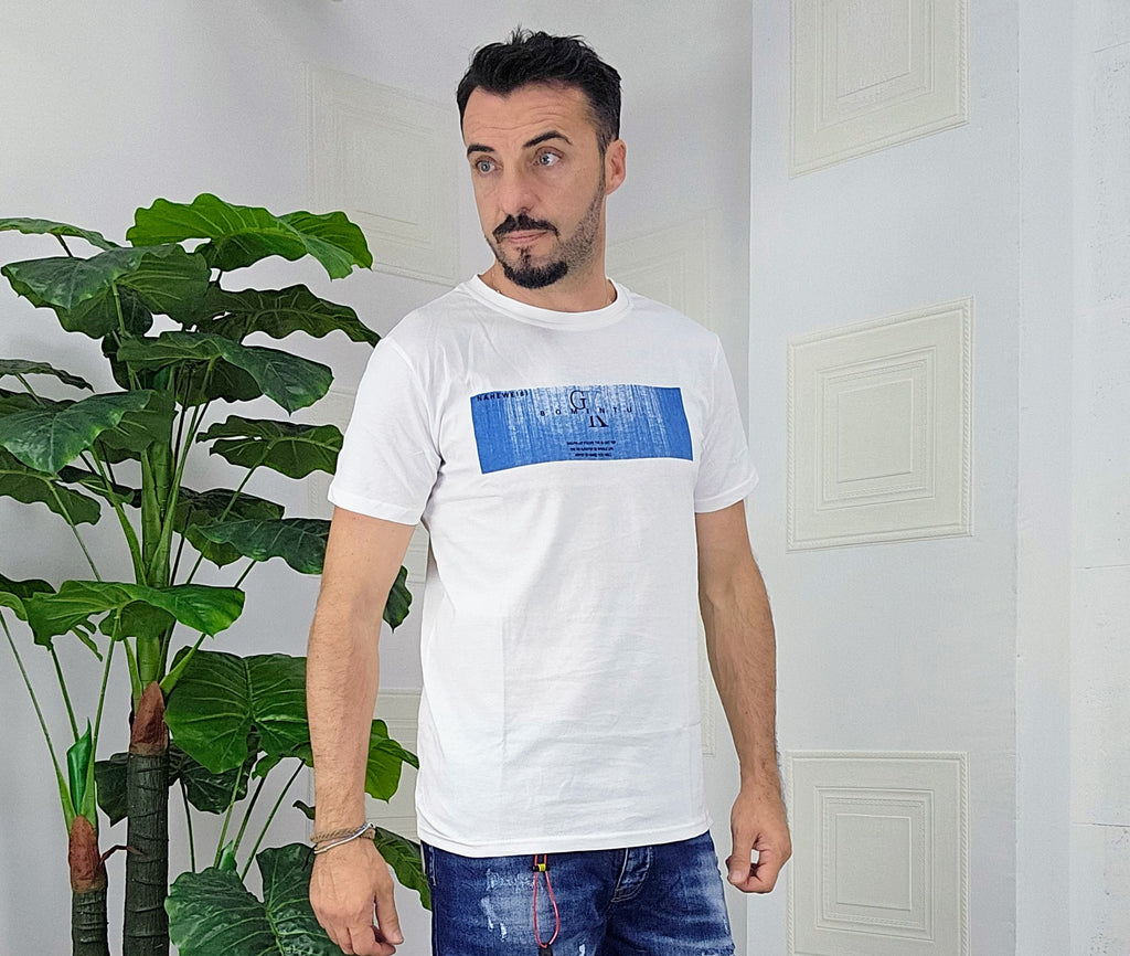 Maglia slim fit con stampa al petto con scritte cucite dalla M alla XXXL, il modello in foto è alto 1.82x76kg è indossa una taglia M.Prodotto Made in Italy