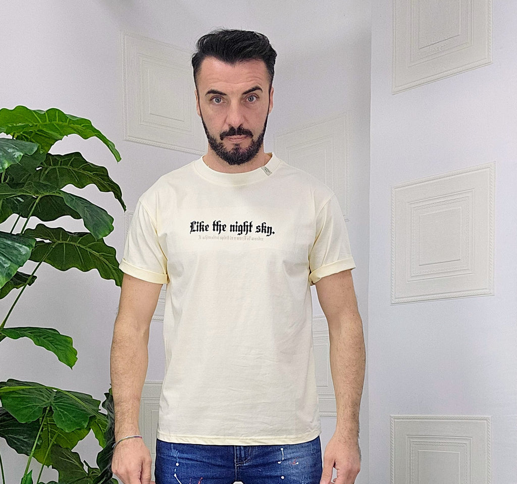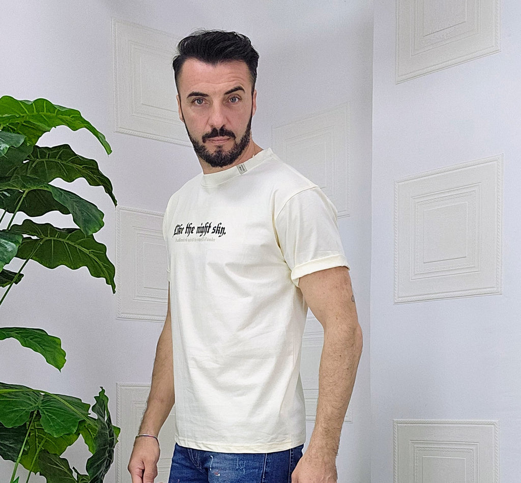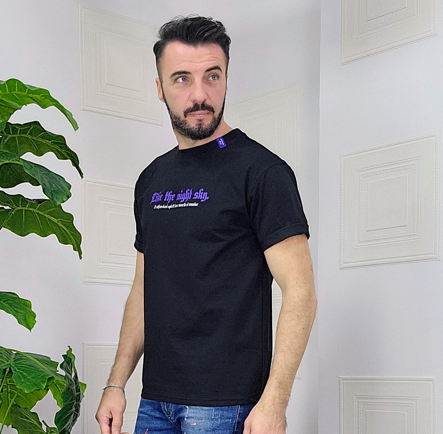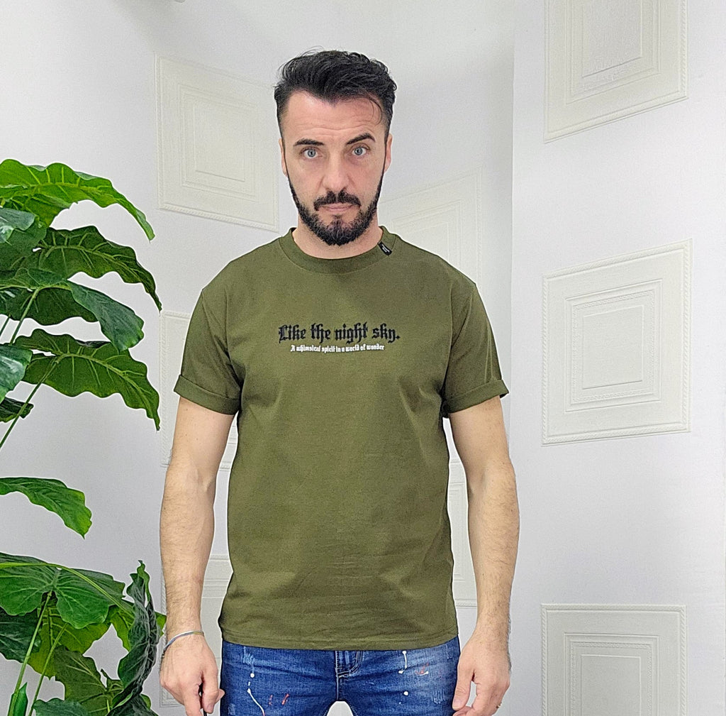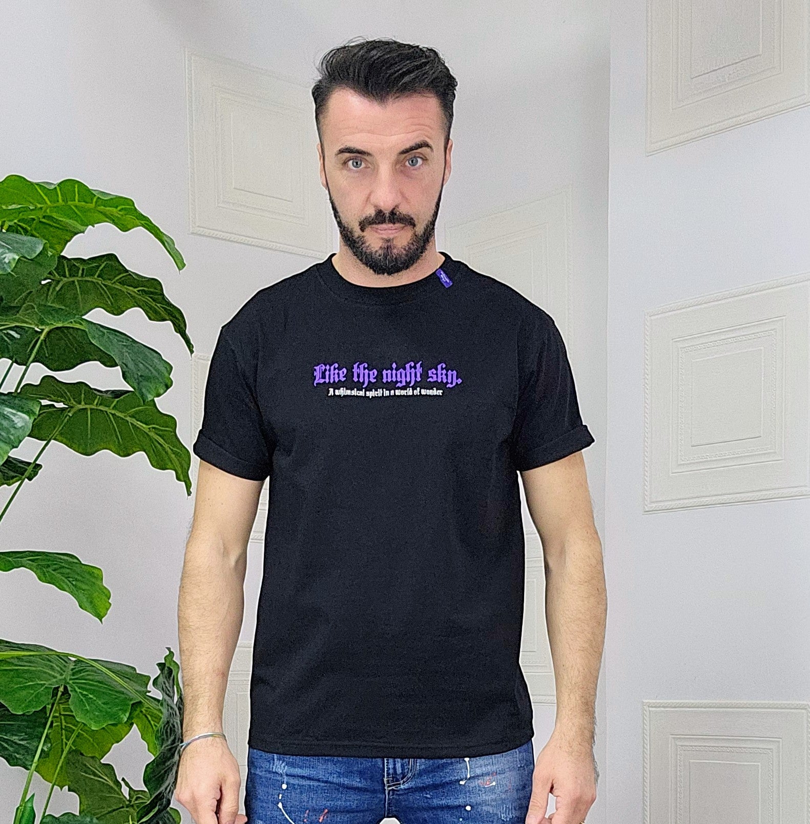 Maglia elastica con scritta cucita più stampa sia sul petto che sul retro sia sul collo dalla S alla XXL, il modello in foto è alto 1.82x76kg è indossa una taglia S.Prodotto Made in Italy