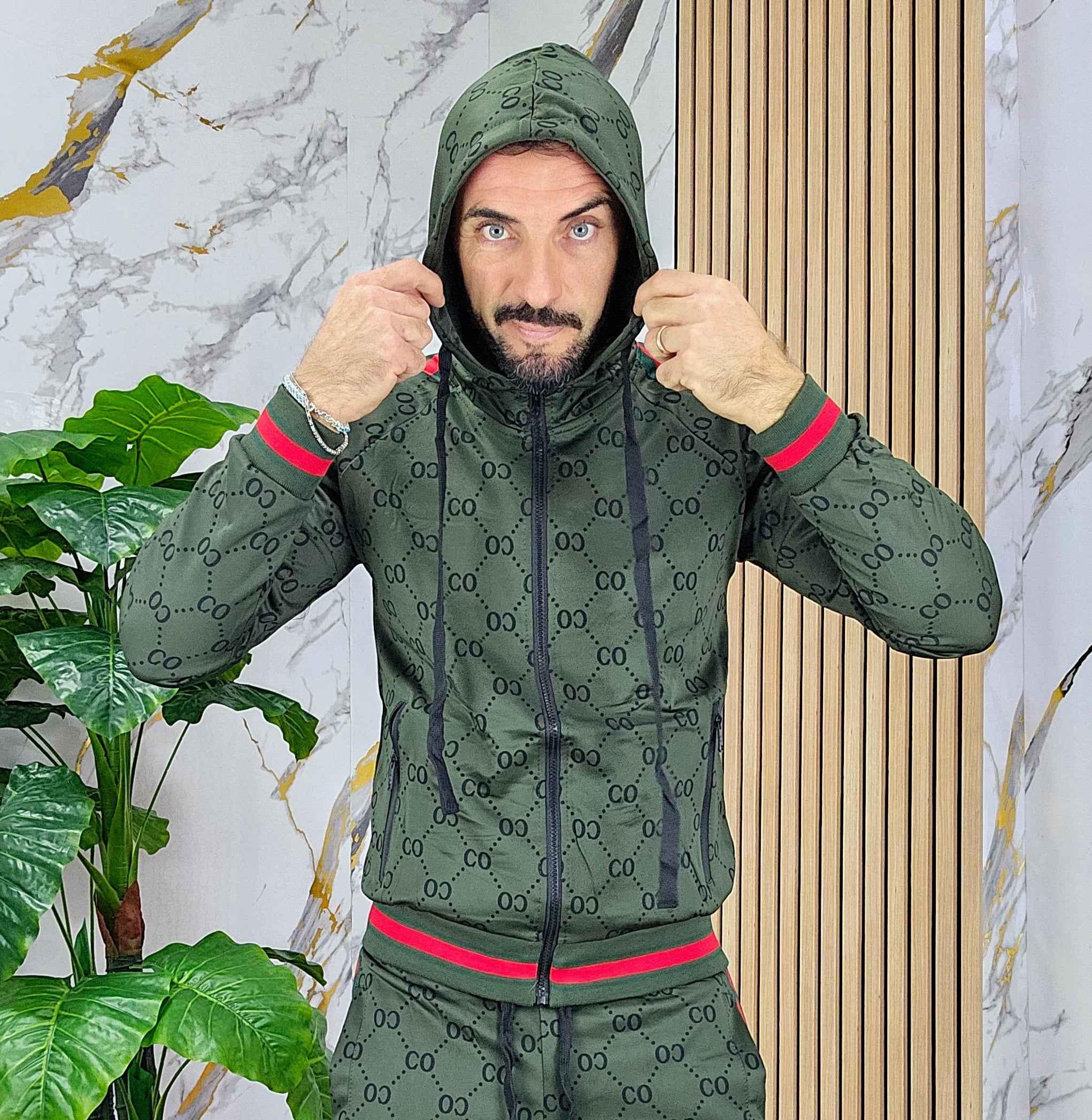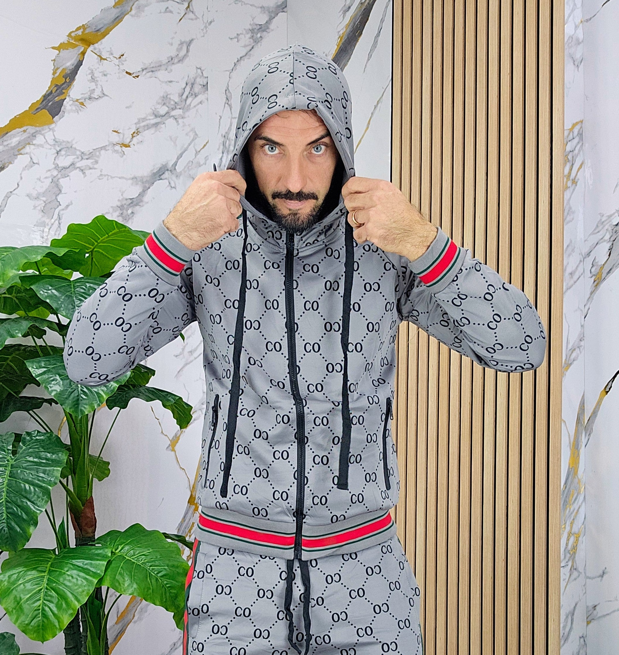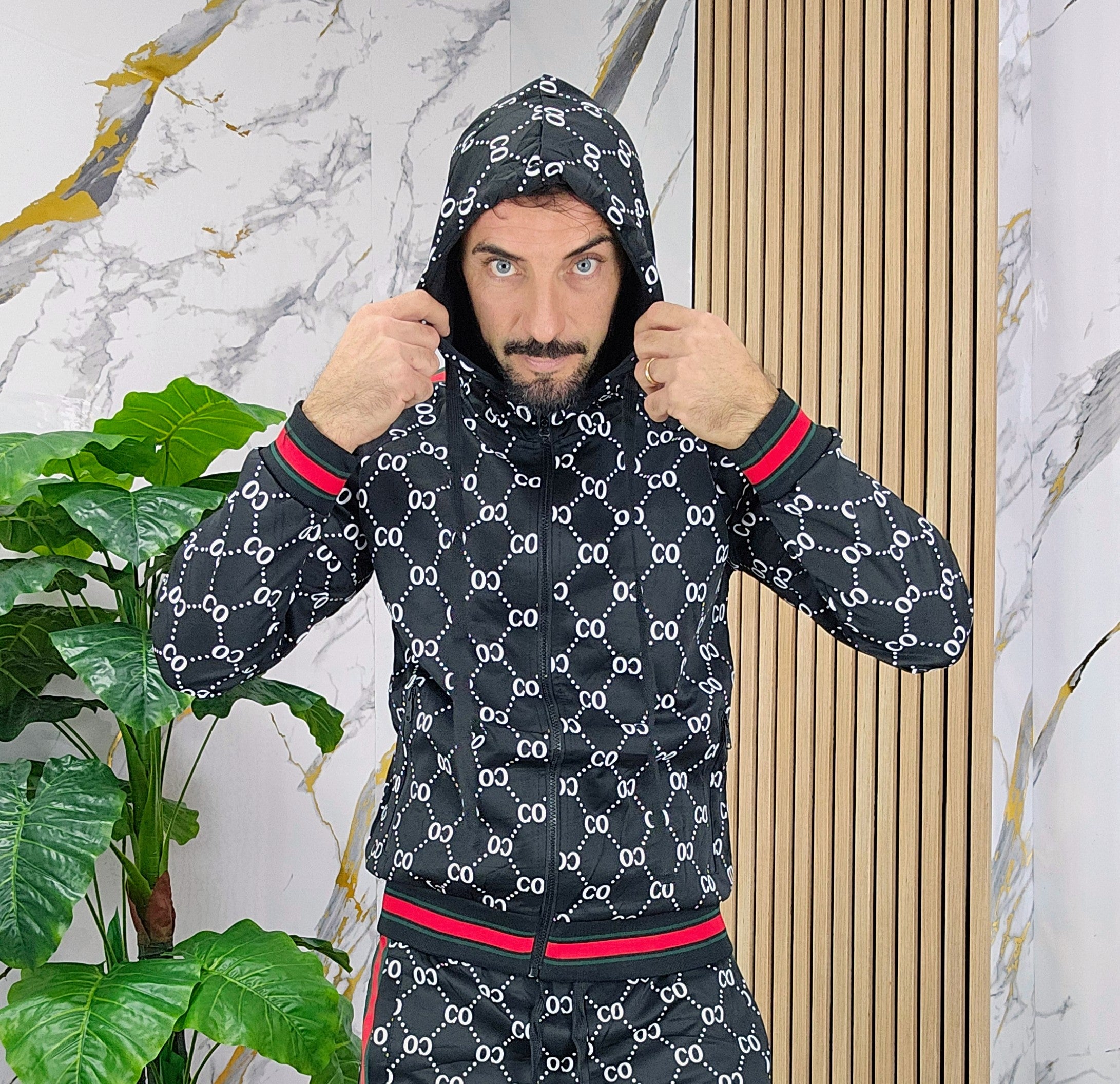 Tuta non felpato slim fit con chiusura zip centrale tasche laterali alla zip cappuccio regolabile pantatuta con 2 tasche laterali polsino alla caviglia bande in tessuto ricucite dalla S alla XXL, il modello in foto è alto 1.82x76kg è indossa una taglia S.Prodotto Made in Italy