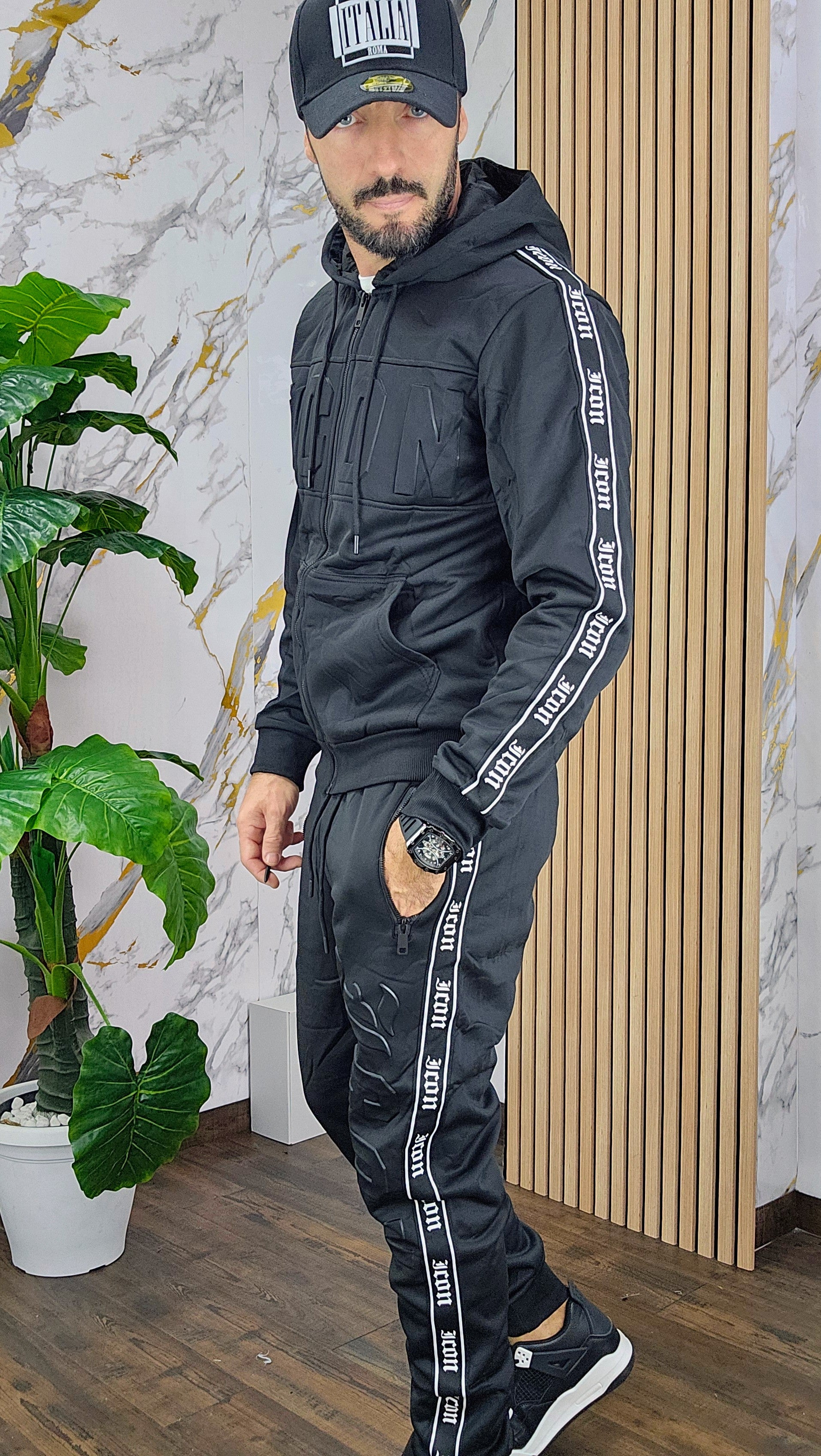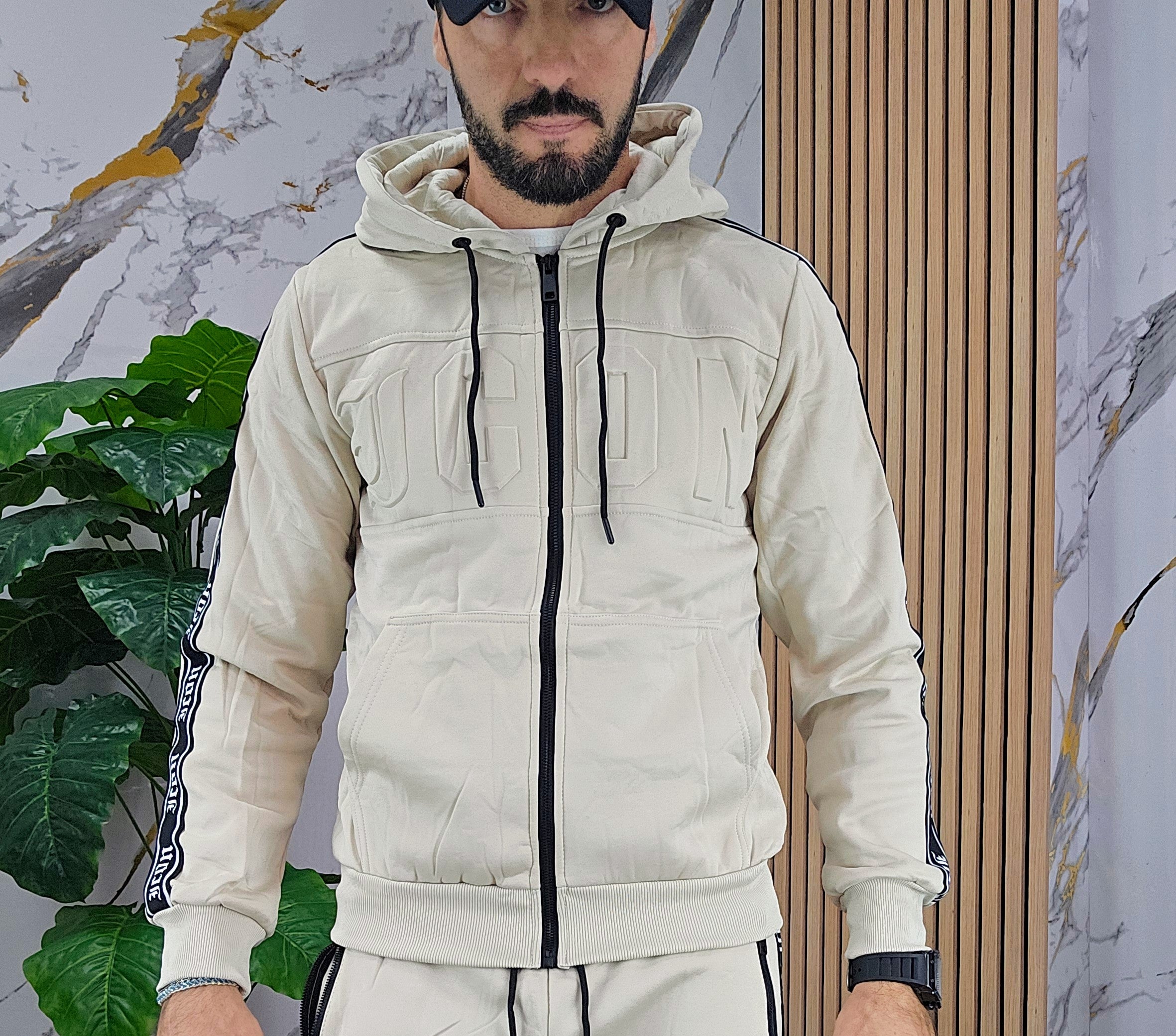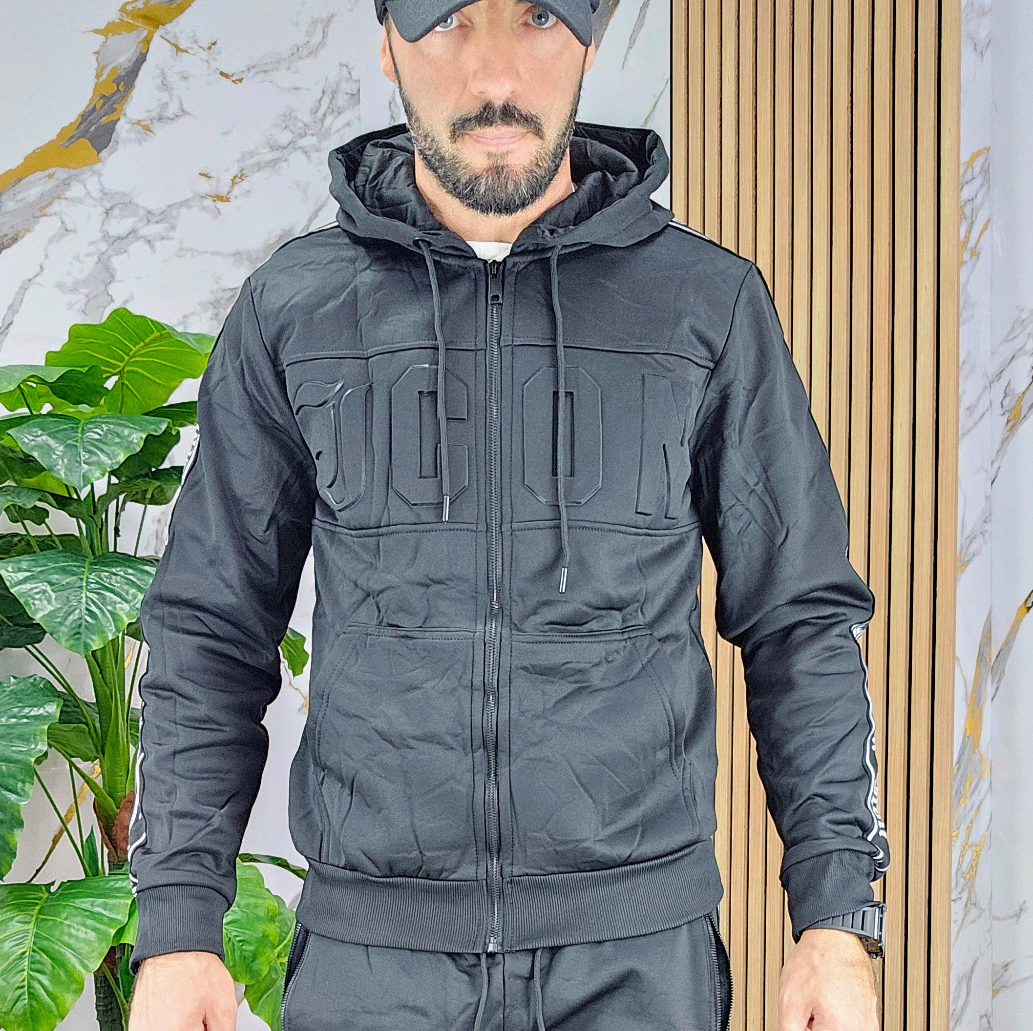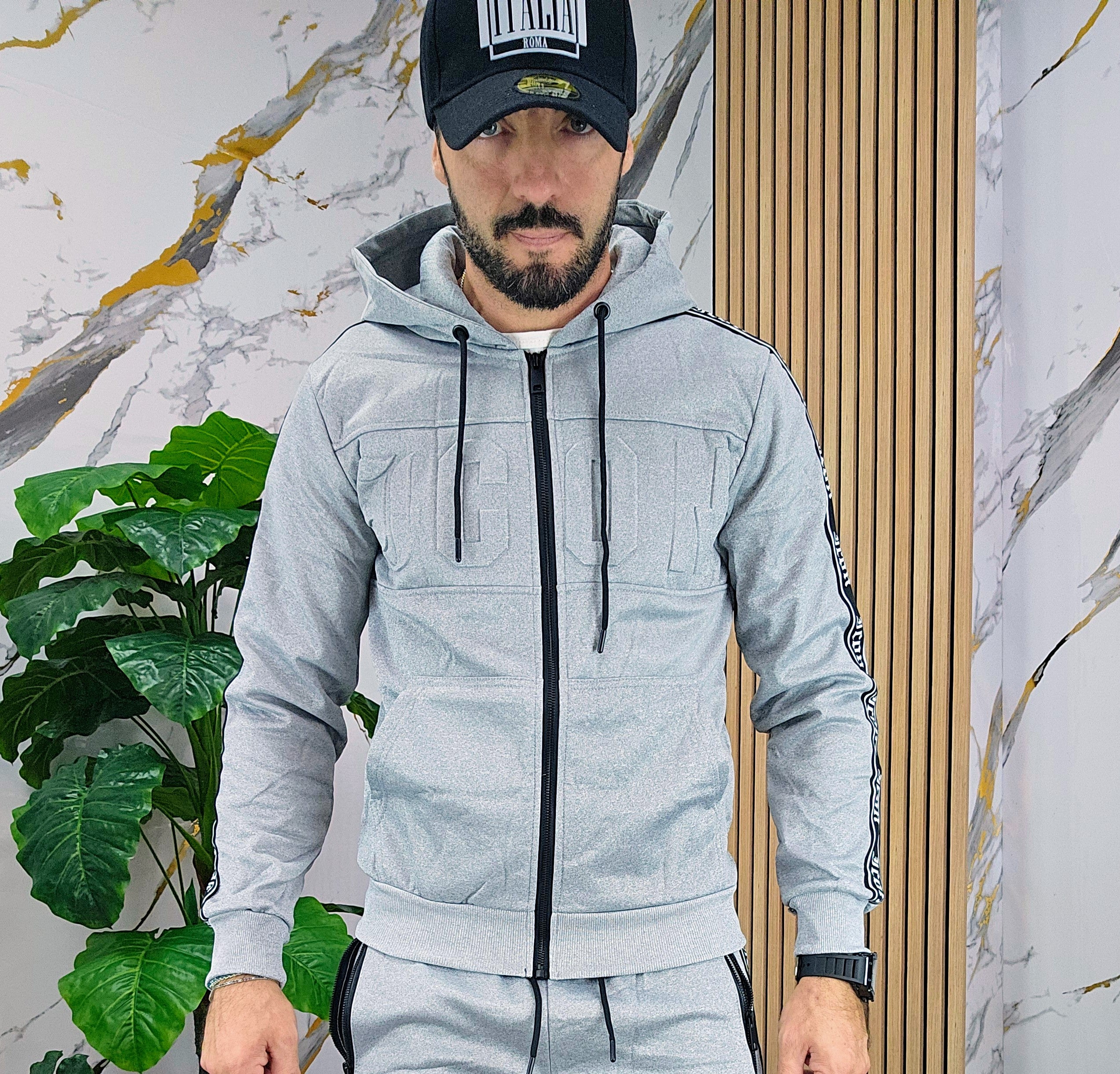 Tuta slim fit felpato all'interno chiusura zip centrale cappuccio regolabile marsupio stampa a fuoco al petto e sulla gamba etichetta icon ricucito pantalone con 2 tasche laterali chiusura zip polsino alla caviglia dalla S alla XXL, il modello in foto è alto 1.82x76kg è indossa una taglia S.Prodotto Made in Italy