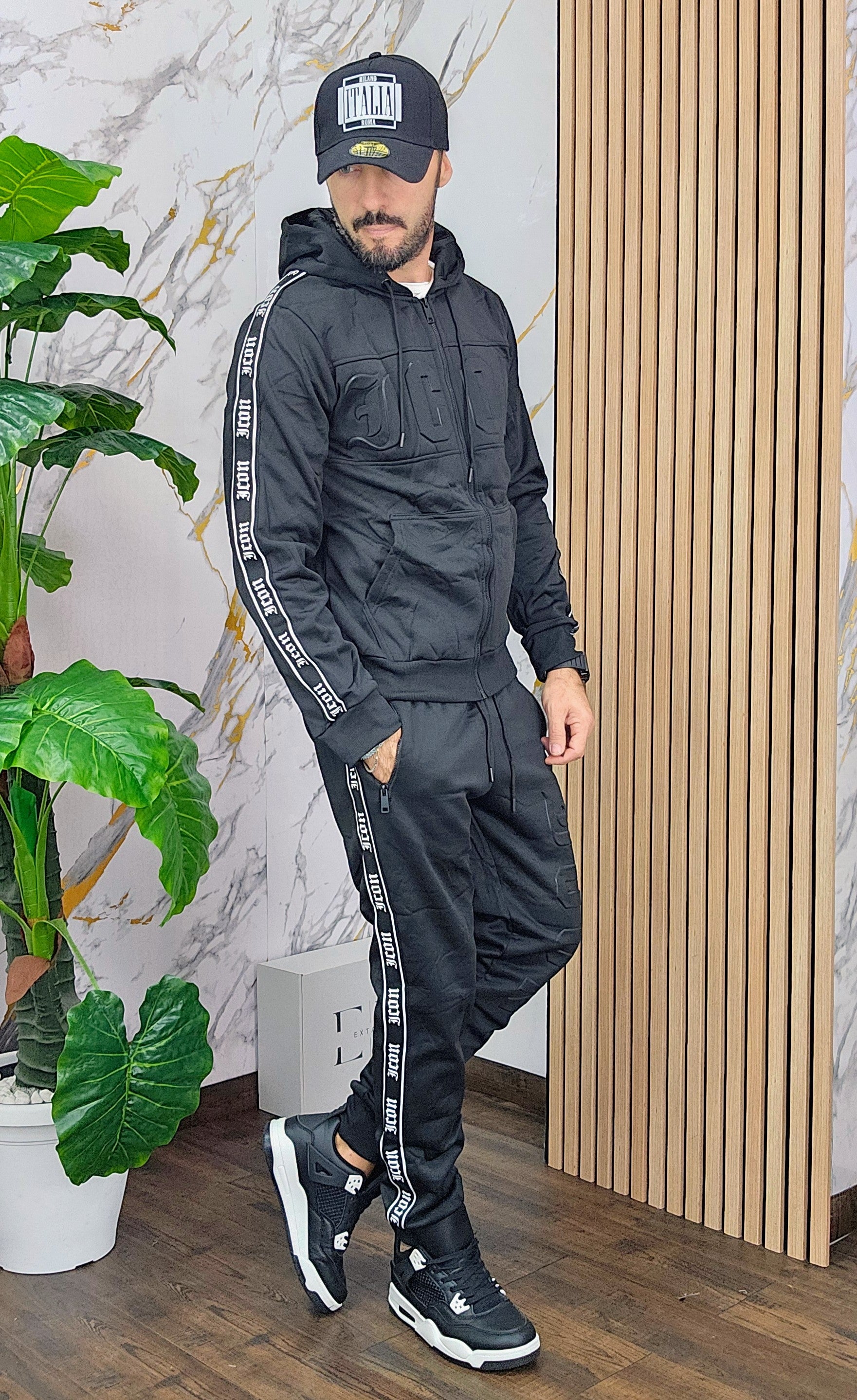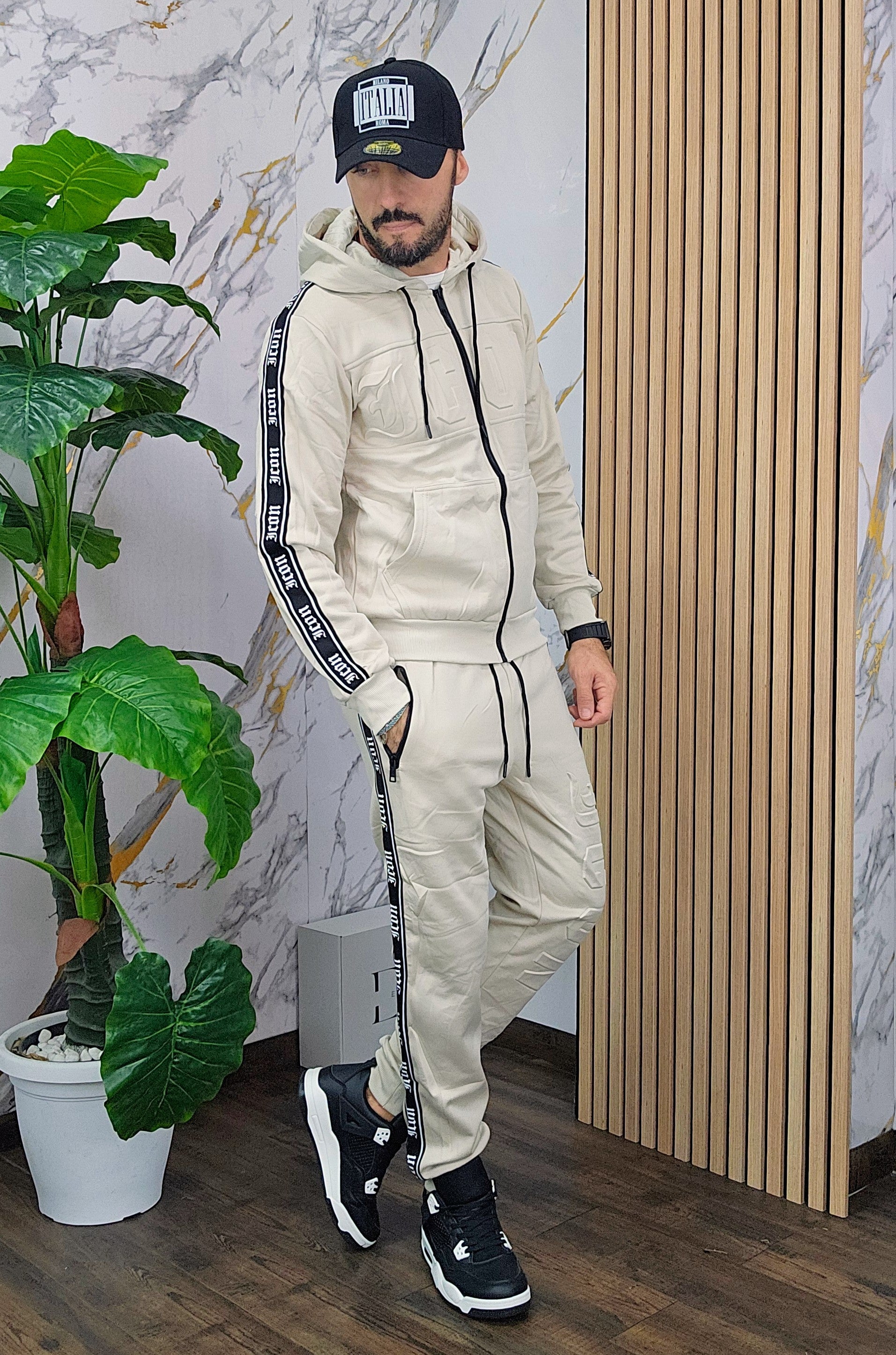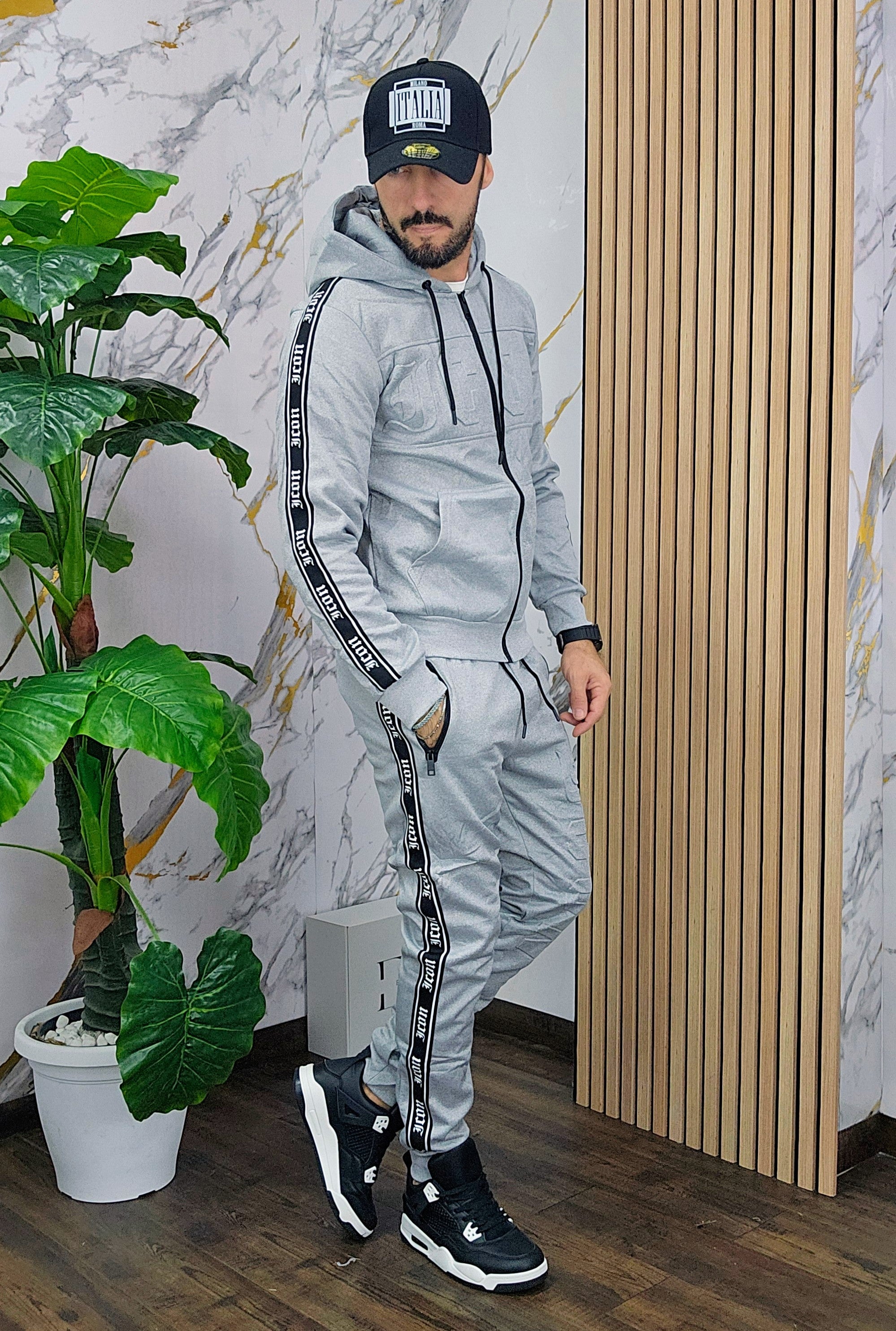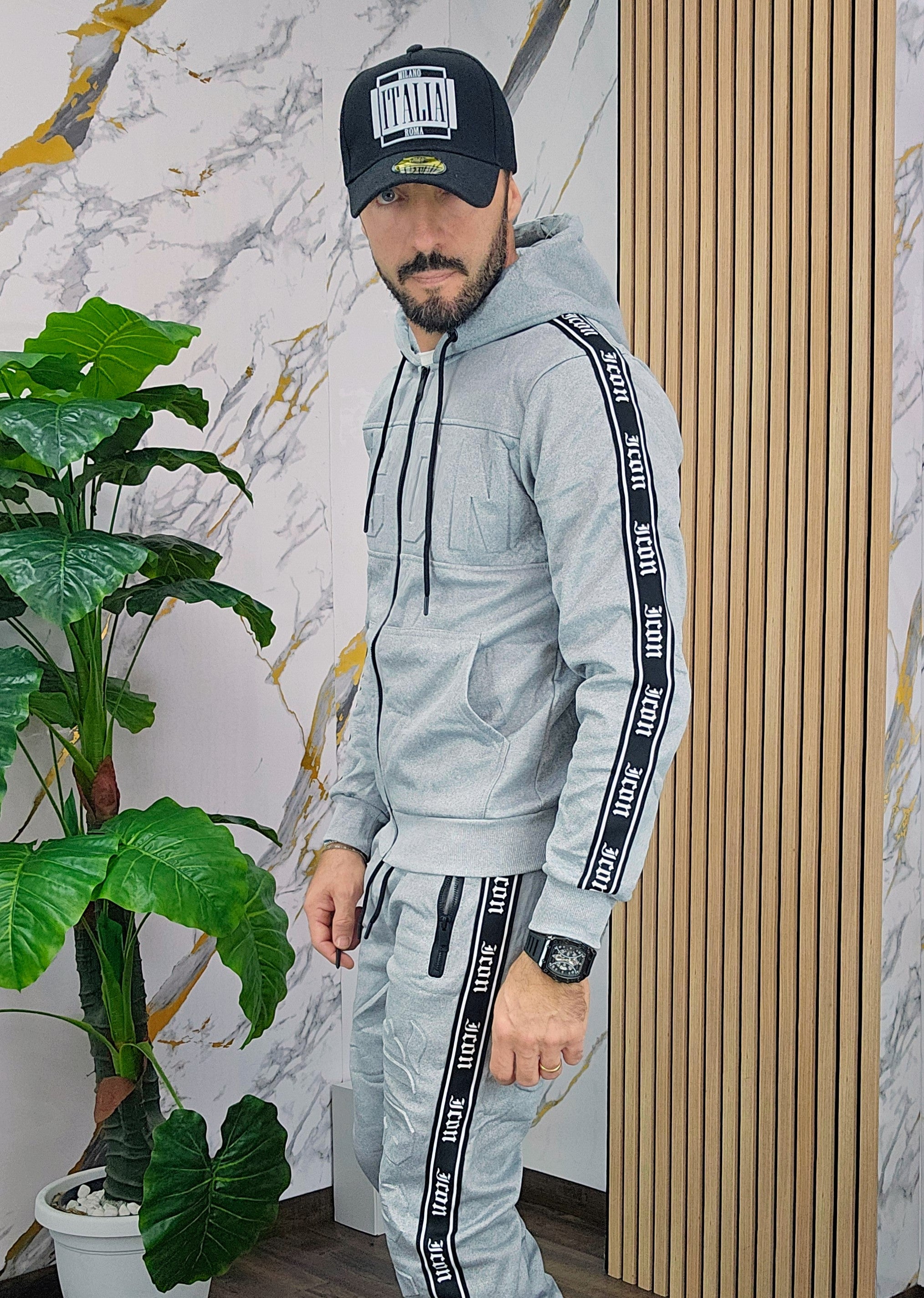 Tuta slim fit felpato all'interno chiusura zip centrale cappuccio regolabile marsupio stampa a fuoco al petto e sulla gamba etichetta icon ricucito pantalone con 2 tasche laterali chiusura zip polsino alla caviglia dalla S alla XXL, il modello in foto è alto 1.82x76kg è indossa una taglia S.Prodotto Made in Italy