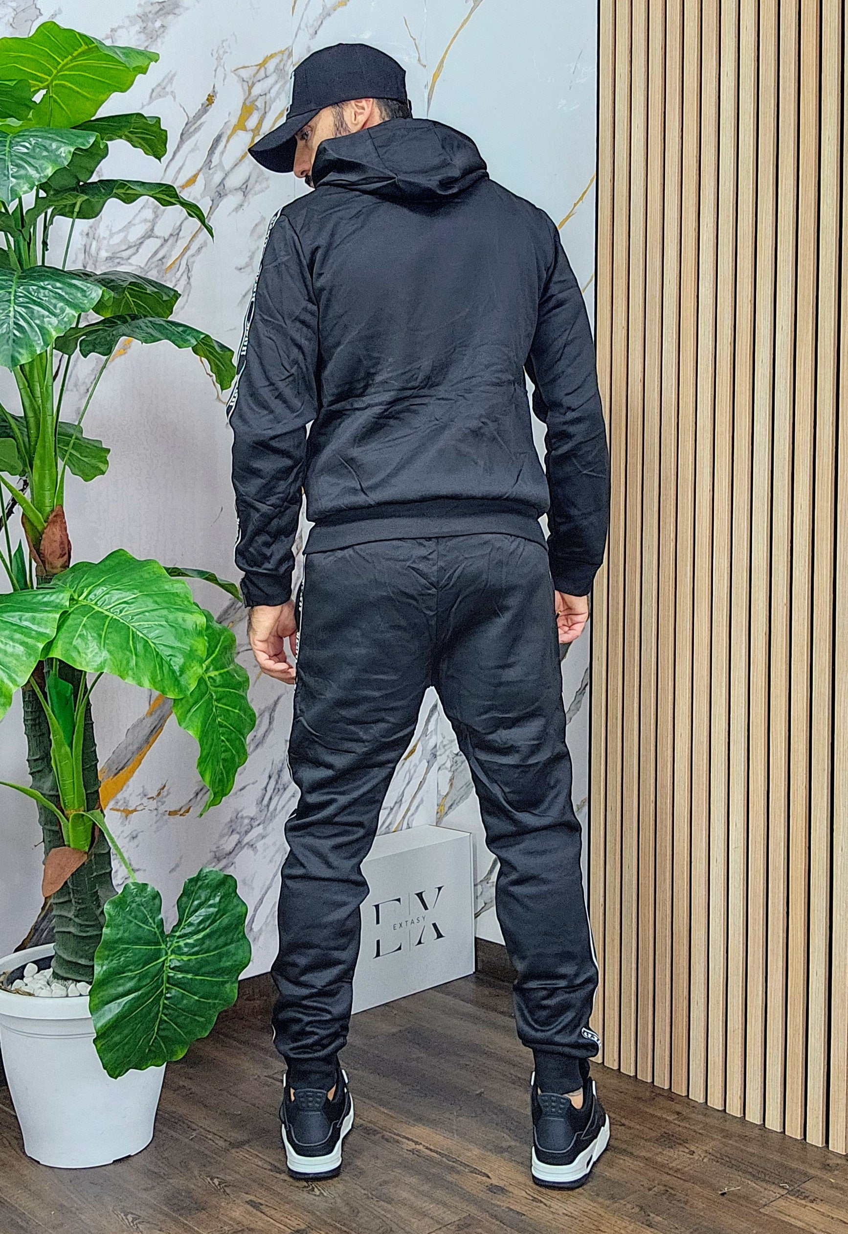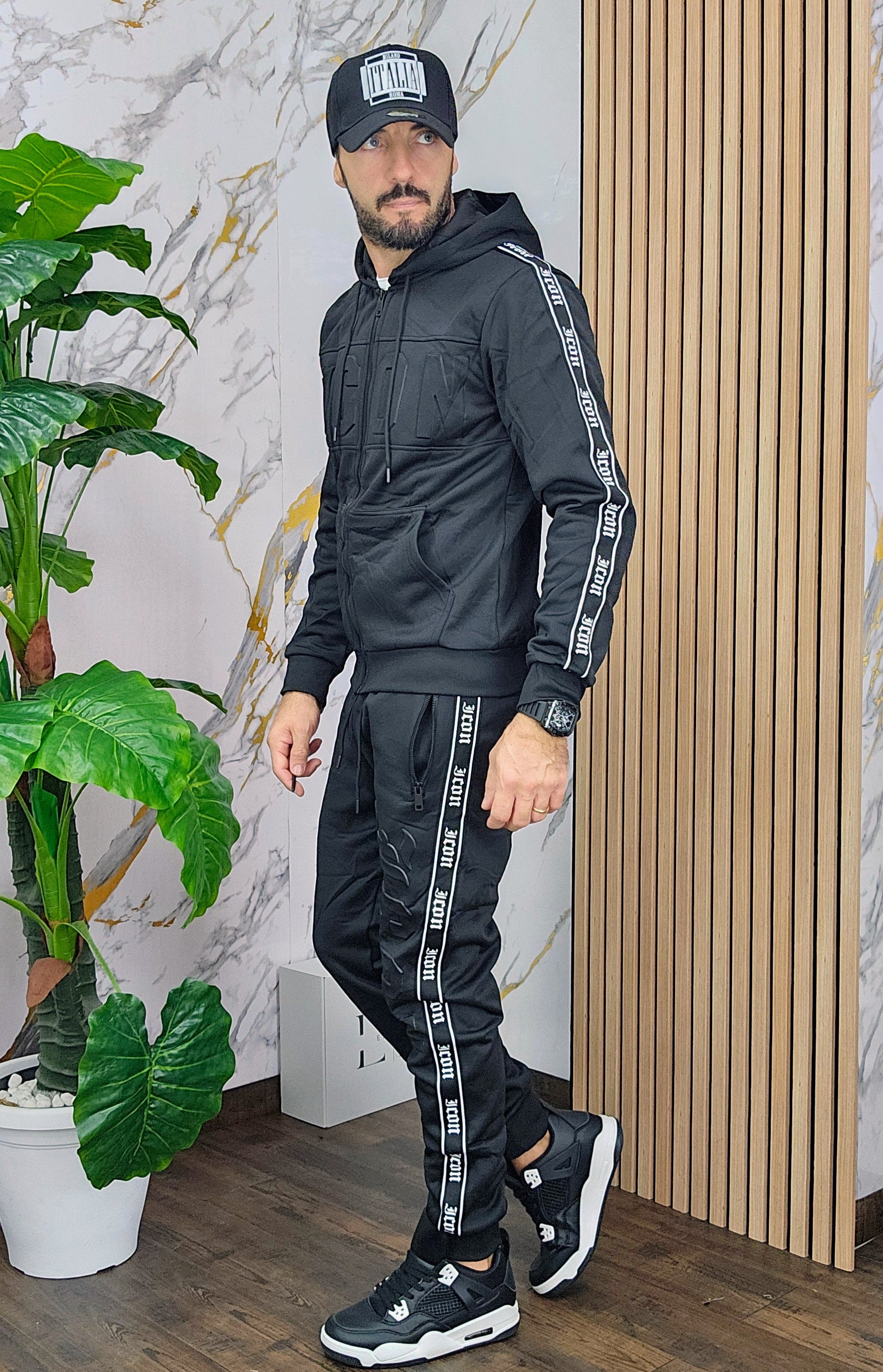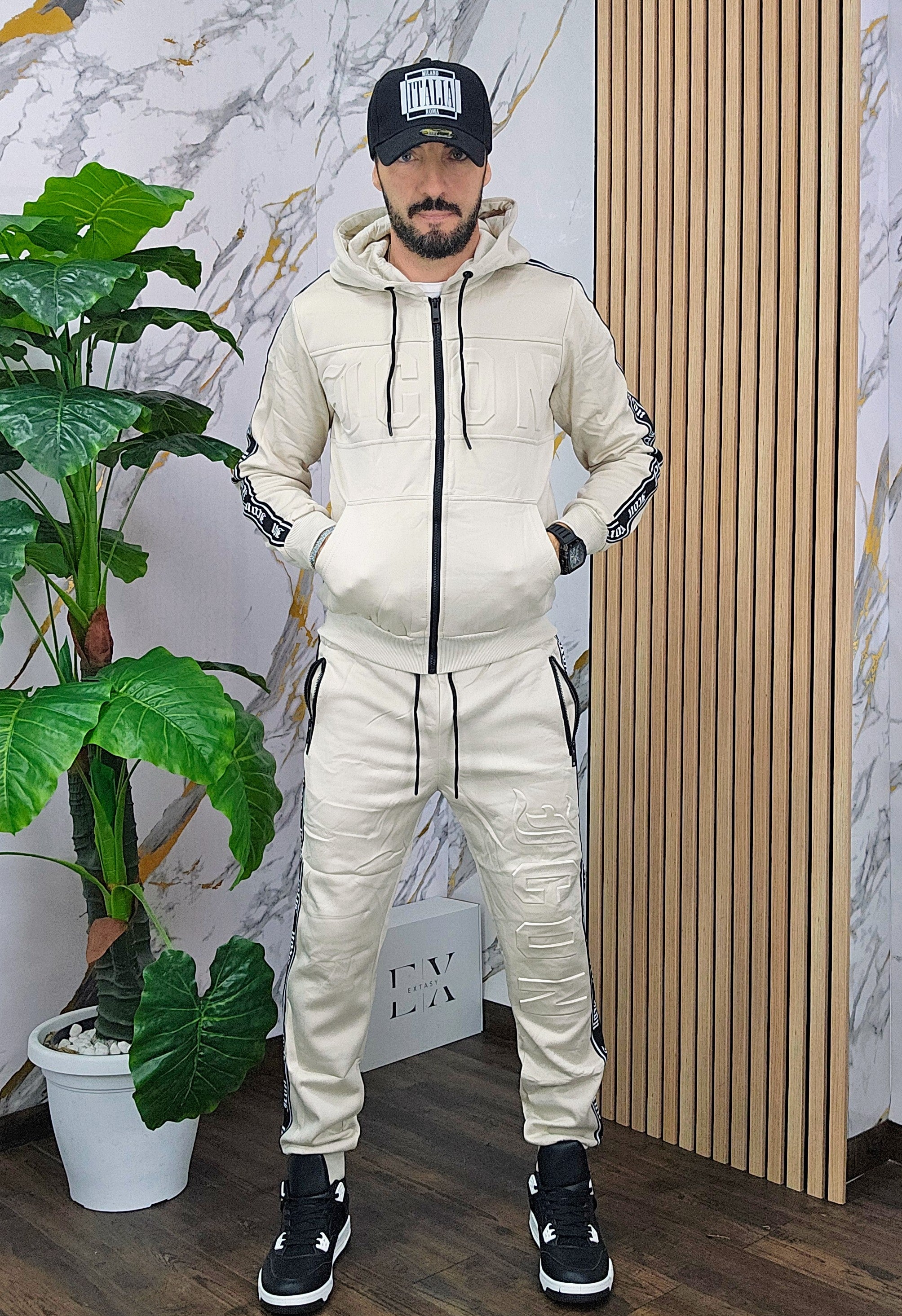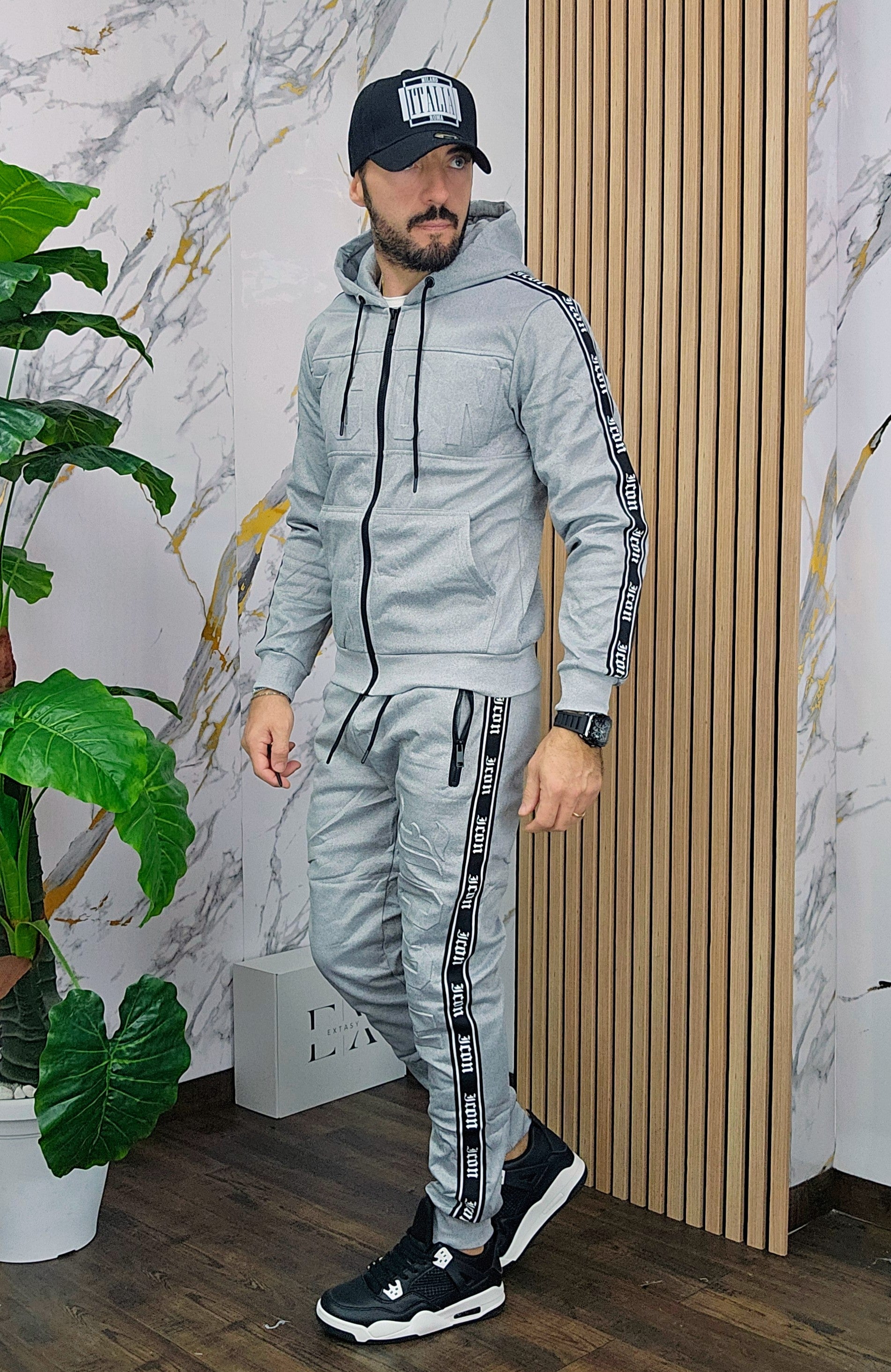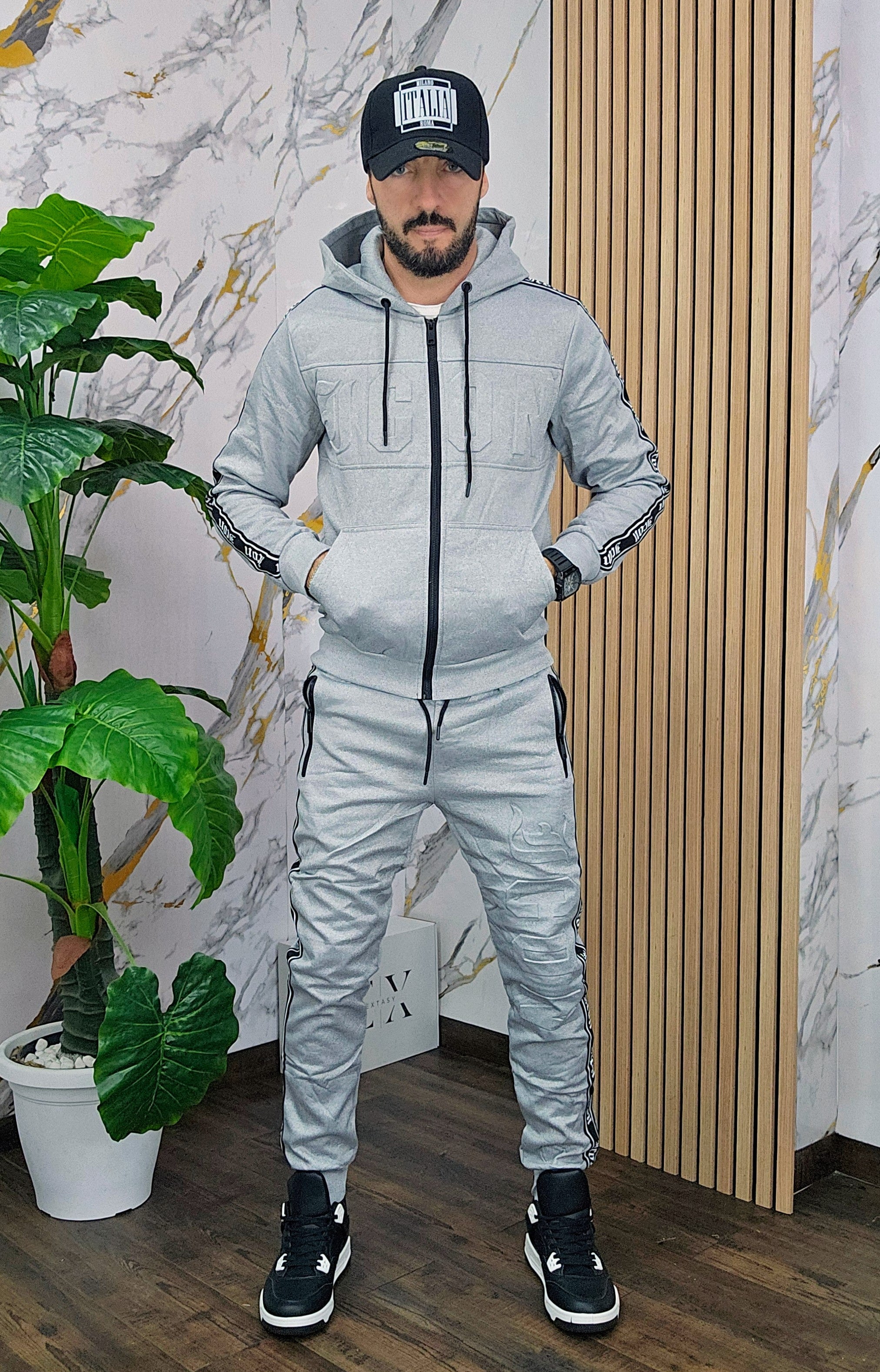 Tuta slim fit felpato all'interno chiusura zip centrale cappuccio regolabile marsupio stampa a fuoco al petto e sulla gamba etichetta icon ricucito pantalone con 2 tasche laterali chiusura zip polsino alla caviglia dalla S alla XXL, il modello in foto è alto 1.82x76kg è indossa una taglia S.Prodotto Made in Italy