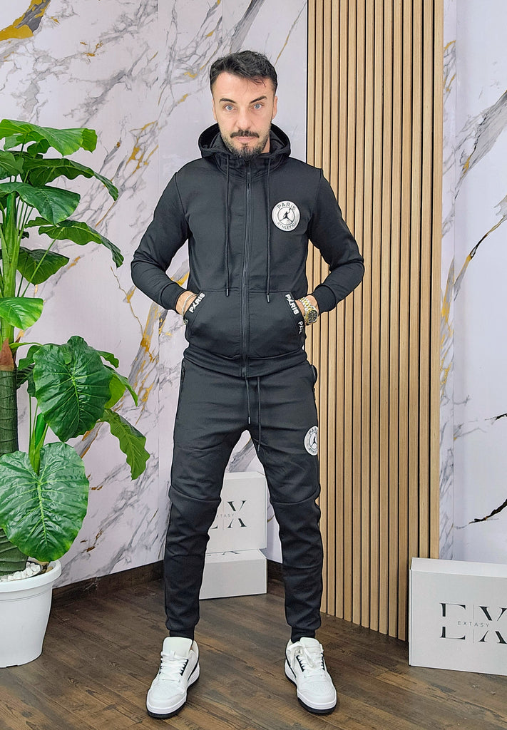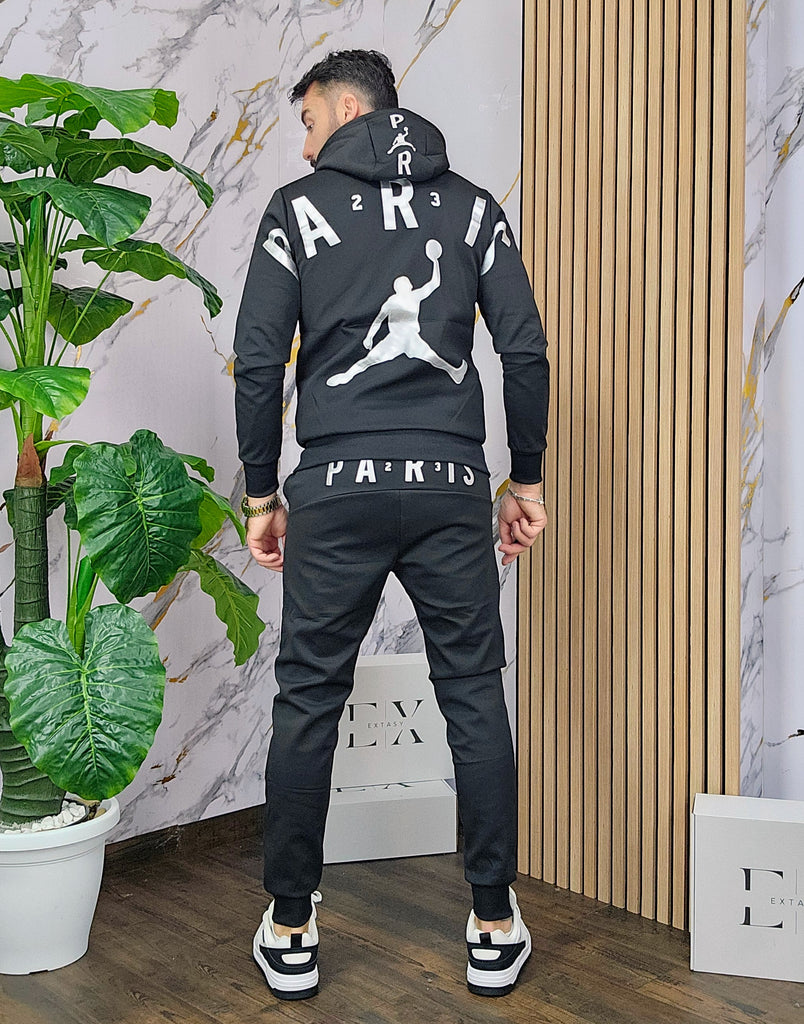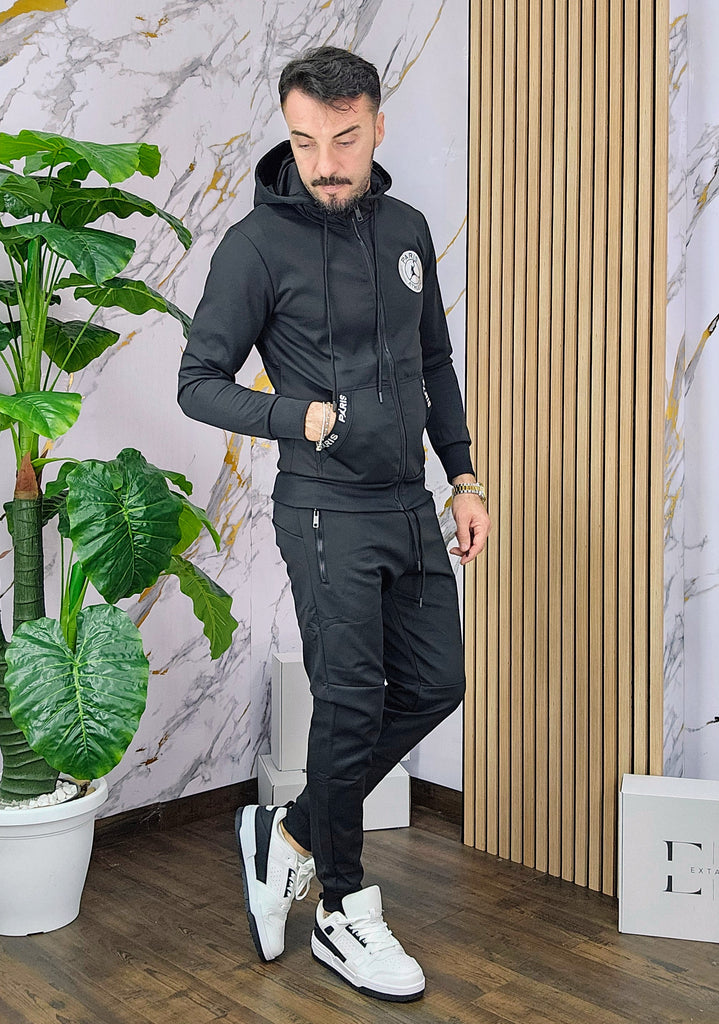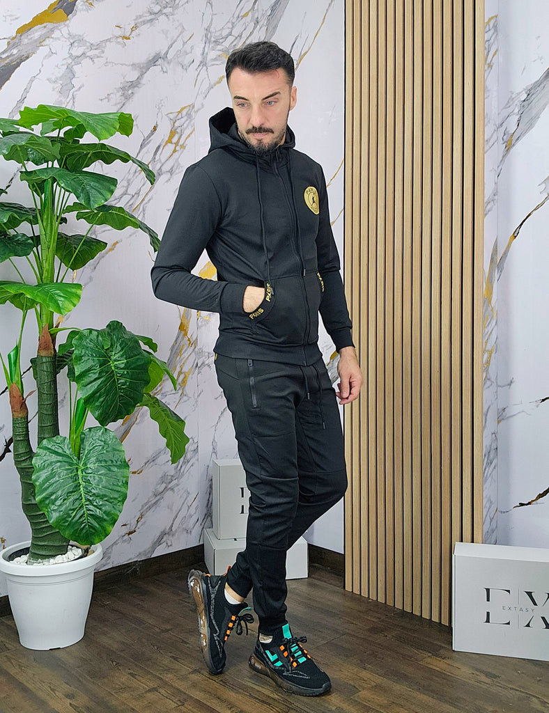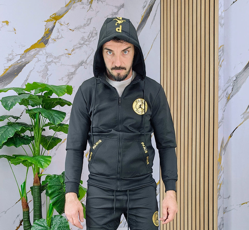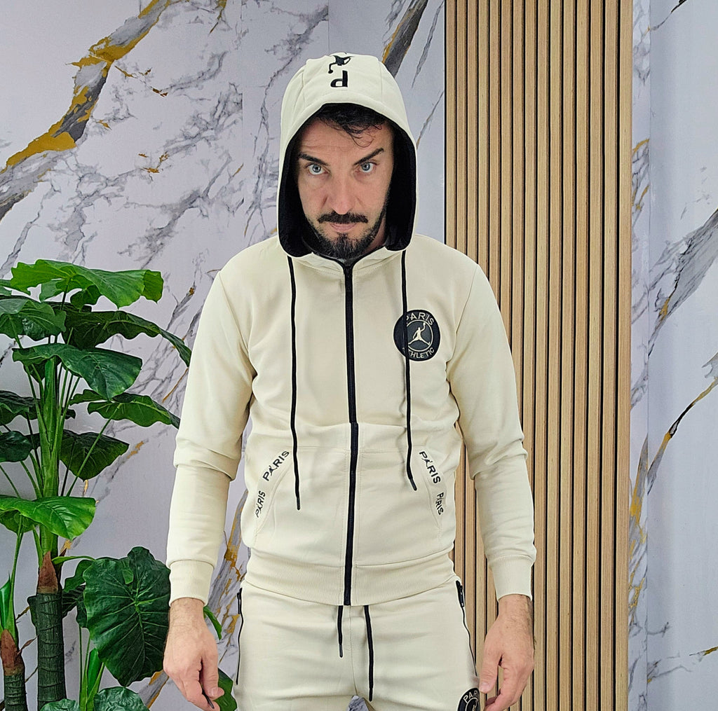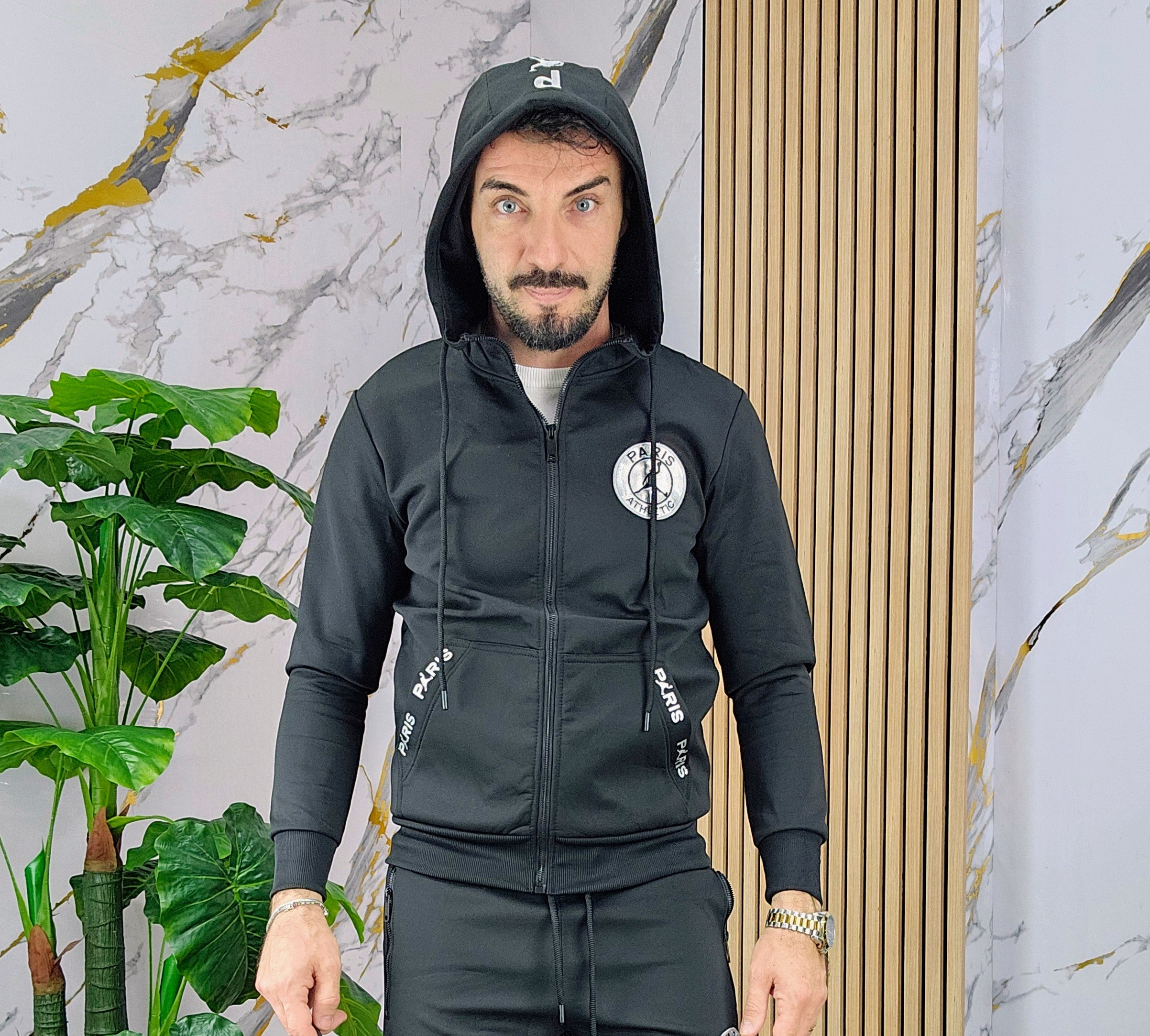 Tuta slim fit con stampe sul retro rialzato cuciture sul cappuccio lato cuore sulla gamba polsino alla caviglia 2 tasche laterali alla felpa 2 tasche laterali alla pantatuta chiusura zip dalla S alla XXL, il modello in foto è alto 1.82x76kg è indossa una taglia S.Prodotto Made in Italy